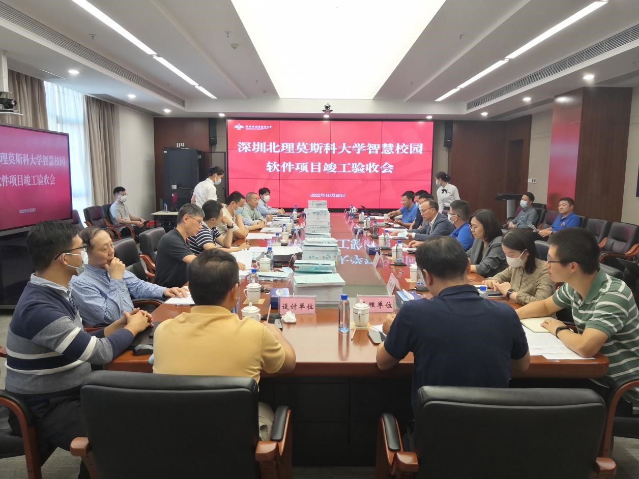 2022年10月26日,深圳北理莫斯科大學組織召開了《深圳北理莫斯科大學智慧校園軟件項目》(以下簡稱項目)竣工驗收專家會。來自政府、高校的七位專家,校黨委書記、副校長朱迪儉、條件保障部部長彭巨光、學生工作部部長張楊、學校辦公室副主任沈文華、組織人力資源部副部長吳映霞以及各用戶部門代表,項目承建單位(江蘇金智教育信息股份有限公司)、監理單位(深圳市艾泰克工程咨詢監理有限公司)、設計單位(深圳天致信息工程咨詢有限公司)代表參加了會議。會議由深圳北理莫斯科大學信息化領導小組辦公室主任鐘南星主持。