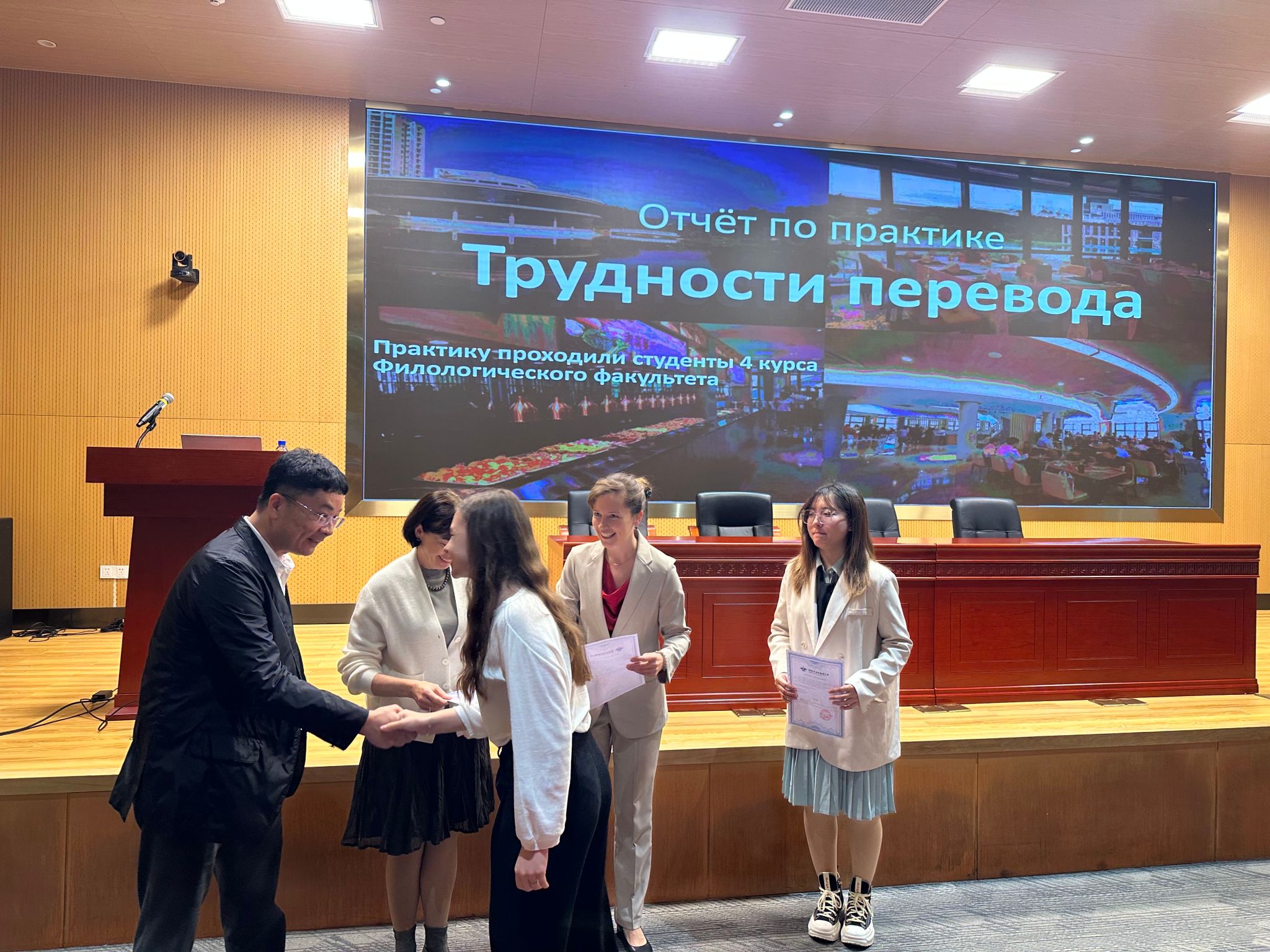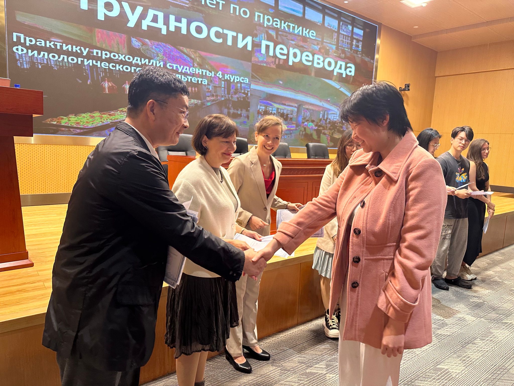 KALMYKOVA MARINA卡爾梅科娃·瑪麗娜老師,DANILINA OLGA達尼利娜·奧莉加系副主任,彭巨光部長給獲獎的同學們頒發獎狀證書。并合影留念。