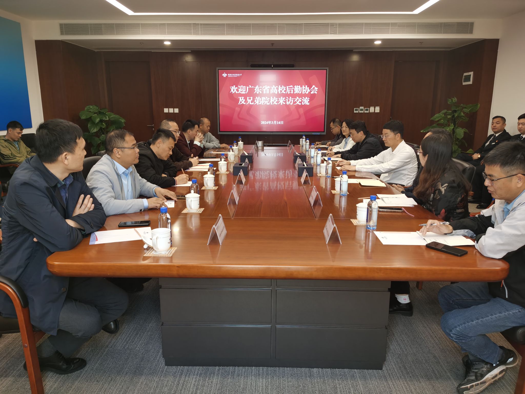 2024年3月14日上午,廣東省高校后勤協會秘書長余曉斌及華南師范大學、廣東財經大學等10所高校的后勤處處長一行來我校調研交流,本次調研座談會由條件保障部部長彭巨光主持,副部長劉永明、胡旦、王昭及部門相關崗位工作人員出席了本次座談會,學校物業、食堂等服務單位也參與了本次會議。