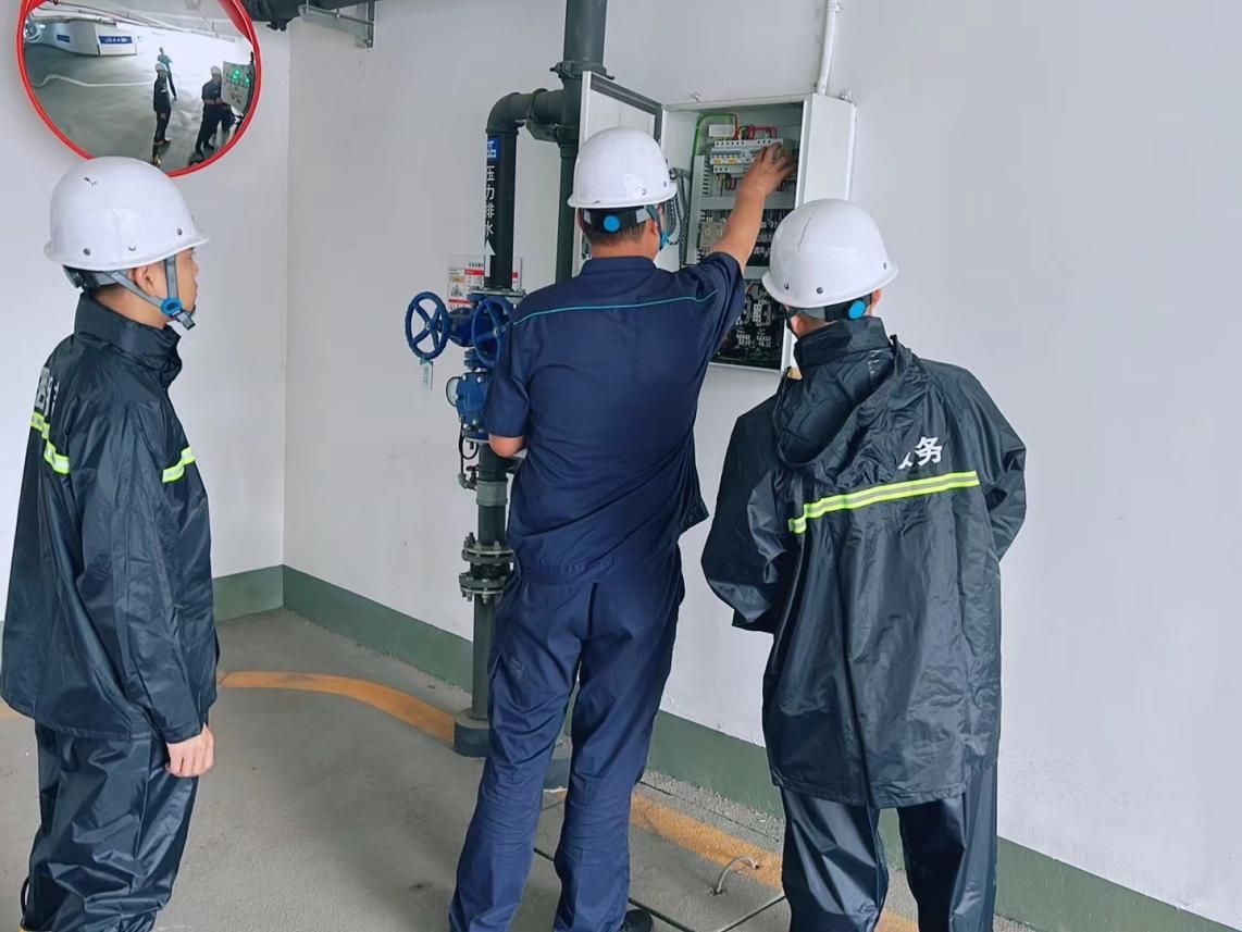 場景五、此外,工程部還專程前往主樓地庫、及其它地庫區域觀察集水井排水情況。認真仔細檢查排水設備,確保排水系統正常運行,為地庫的安全提供了有力保障。
