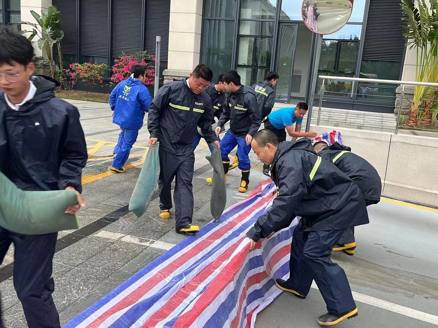 場景三、在防汛搶險過程中,沙袋作為重要的防洪物資,發揮了不可替代的作用。工程部門與秩序部緊密配合,迅速搬運沙袋至主樓地庫入口處,關閉防洪閘,鋪設彩條布,用防洪沙袋一層層結實封堵,為控制洪水進入主樓地庫打下了堅實的基礎。這一舉措有效防止了洪水倒灌,確保了地庫內的設備和財產安全。