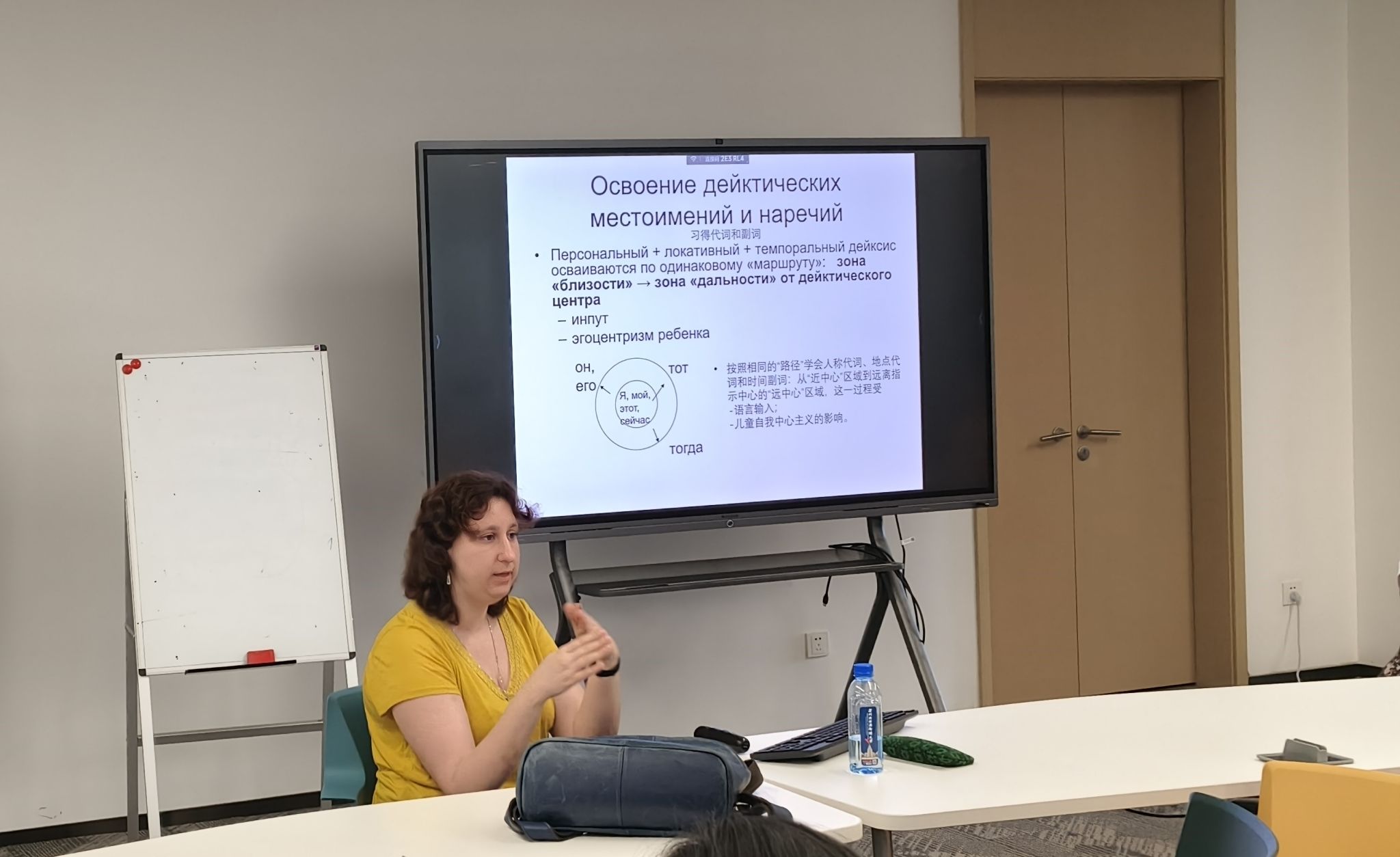 講座圍繞功能語法理論的定義、發展歷程及其主要原則,帶領師生走進功能主義的世界。沃耶依科娃首先介紹俄羅斯圣彼得堡功能語法學派,闡釋語法功能化趨勢及其主要特征,并列舉了多個語法現象,如名詞的有生命性、指小表愛的單詞等,幫助師生理解俄語語言單位的結構功能和語義功能。接著,她從功能的目的論、因果論,功能語義場,范疇情景等多個角度切入,強調不同層級的語言手段表達某一語義類別,分析了功能語法理論如何幫助理解語言單位在語境中的作用。最后,沃耶依科娃邀請索菲婭·維克托羅夫娜·克拉斯諾什切科娃副教授講述圣彼得堡功能語法學派最新研究課題《語言功能范疇的系統關聯》,后者通過研究兒童言語揭示系統性習得代詞和副詞。