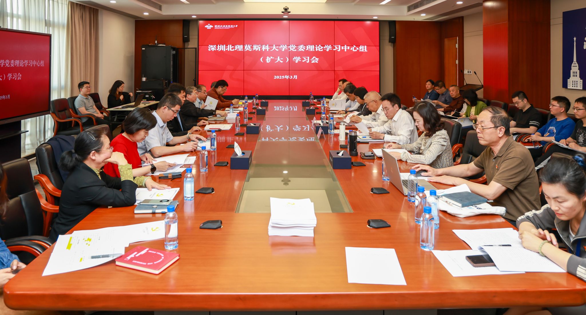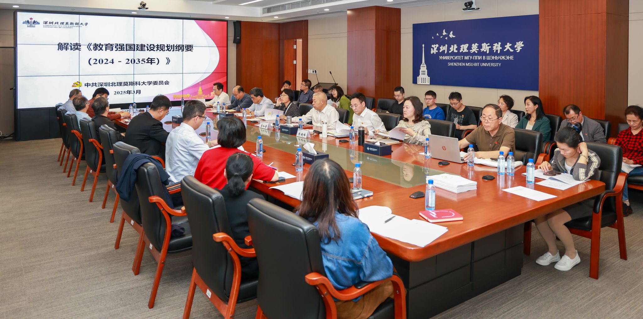 3月26日,深圳北理莫斯科大學召開黨委理論學習中心組擴大學習會,深入學習習近平總書記在2025年全國兩會期間的重要講話精神,專題解讀《教育強國建設規劃綱要(2024-2035年)》,并圍繞學校2030年發展規劃進行研討。校長、黨委副書記李和章,黨委副書記、紀委書記陳超峰,學校全體中方中層干部、各黨支部書記參加學習。陳超峰主持會議。