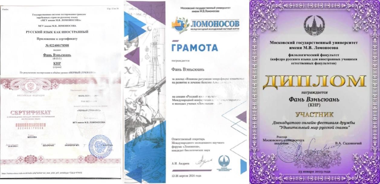 除學習成績之外,她還注重自身語言能力的提升,大一通過對外俄語一級、俄語六級考試,在“羅蒙諾索夫”國際青年學者學術論壇上用俄語分享生物專業報告,獲優秀匯報人的稱號,斬獲校內各類俄語競賽大獎。