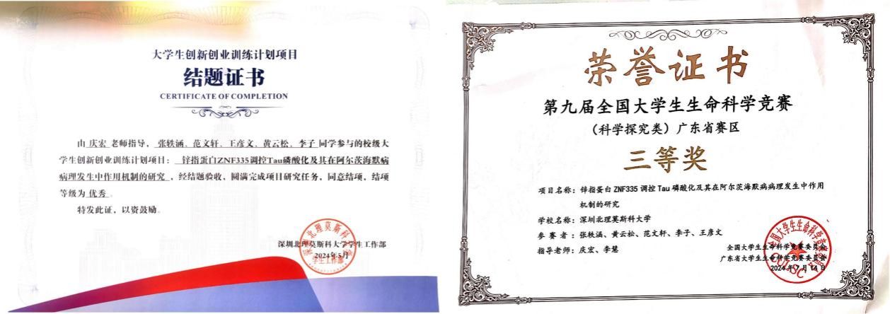 大一時期,范文軒便十分重視生物學科中實踐的重要性,她進入北京理工大學慶宏教授課題組,學習分子細胞實驗,她在課題“ZNF335調控Tau磷酸化及其在AD發生中作用機制的研究”中全權負責比賽中分數占比最重的實驗記錄撰寫部分,整理上傳20篇近3萬余字實驗記錄,最終課題組在第九屆全國大學生生命科學競賽科學探究賽道廣東省賽區獲得三等獎,創造了學校在CULSC賽事上“零獎項”的突破。