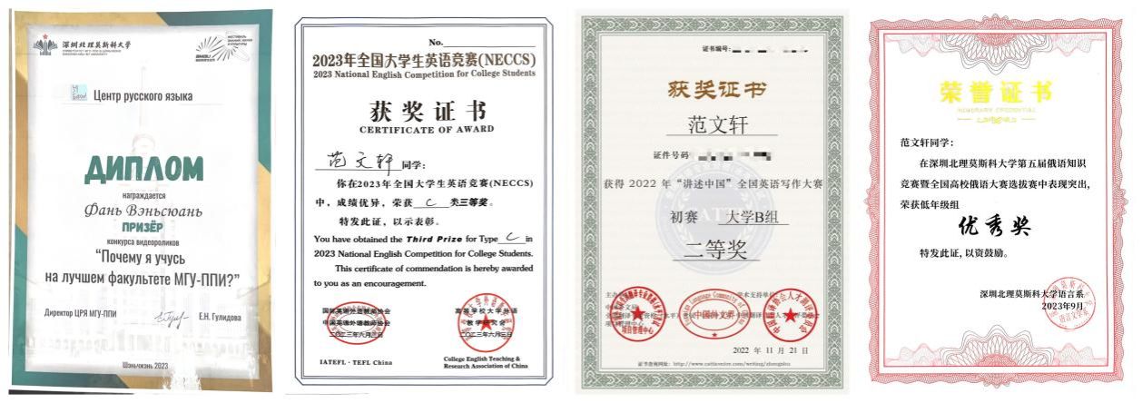 在學好俄語的同時,她在英語方面同樣表現突出,先后獲得中國外文局翻譯院Catti“講述中國”全國英語寫作大賽大學B組二等獎、全國大學生英語競賽全國C類三等獎,多次在外研社·國才杯全國英語閱讀、演講校級初賽中取得優異成績。
