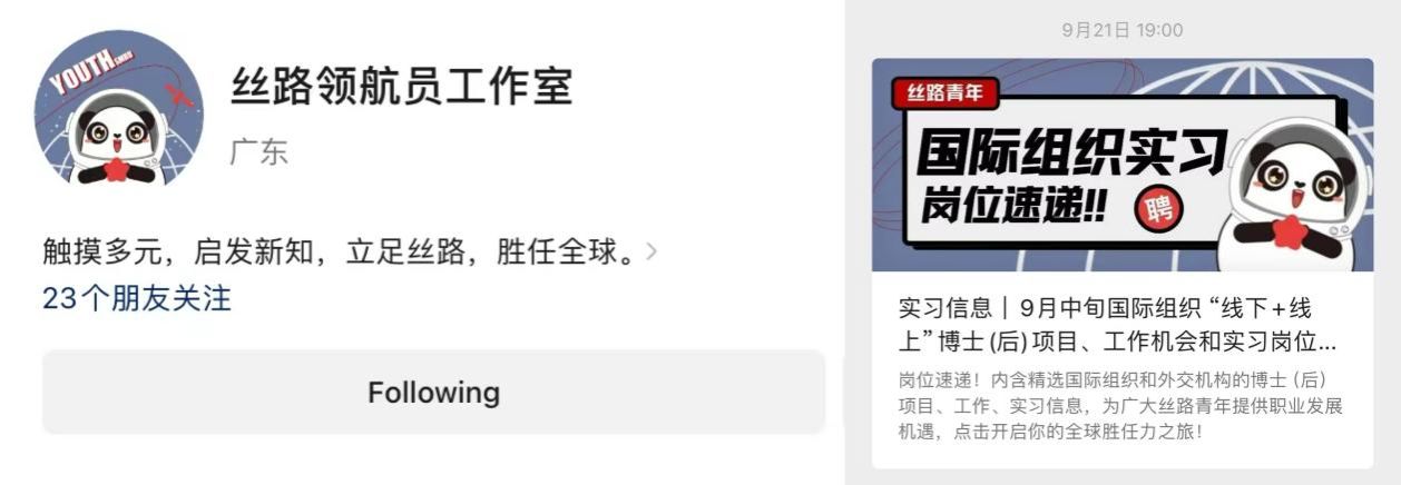 她深度踐行“國際視野+本土情懷”的雙向融合:運營“絲路領航員工作室”公眾號平臺為全國學子推送國際組織實習信息。