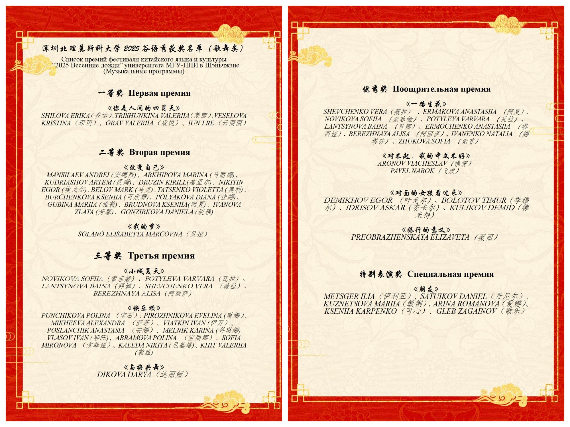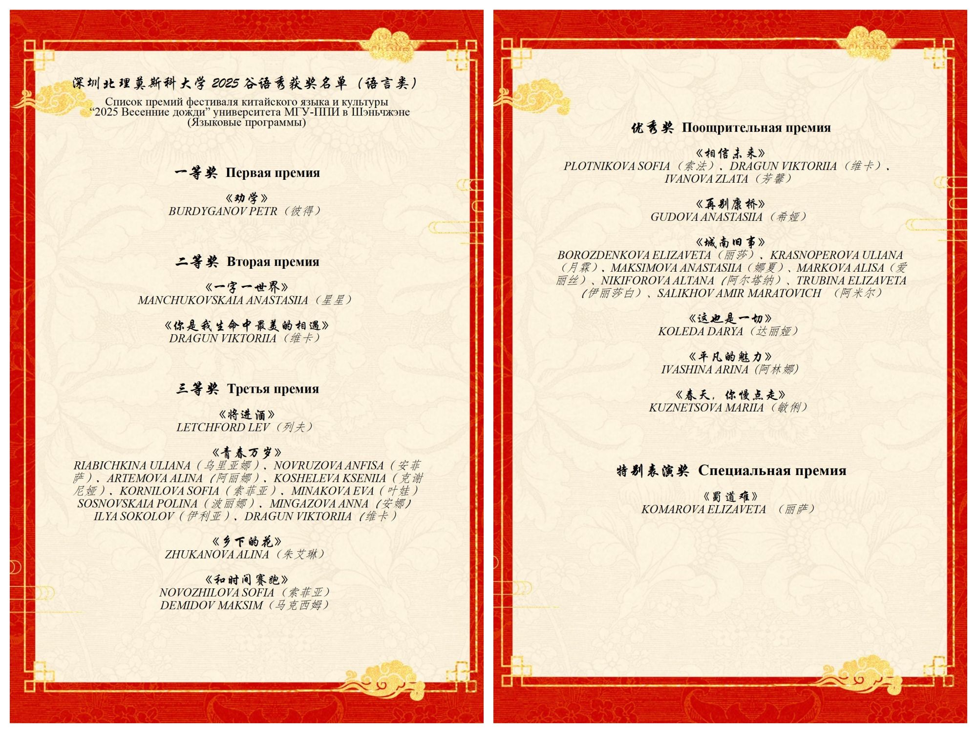 本屆谷語秀晚會首次將節目分為語言、歌舞兩大類進行計票評選。經過專家評審和現場觀眾限時投票,2023級漢語言專業BURDYGANOV PETR(彼得)的《勸學》斬獲語言類一等獎,2024級漢語言專業SHILOVA ERIKA(香運)、TRISHUNKINA VALERIIA(萊茵)、VESELOVA KRISTINA(琛玥)、ORAV VALERIIA(欣悅)、IUN I RE(云麗麗)的《你是人間四月天》摘得歌舞類一等獎。
