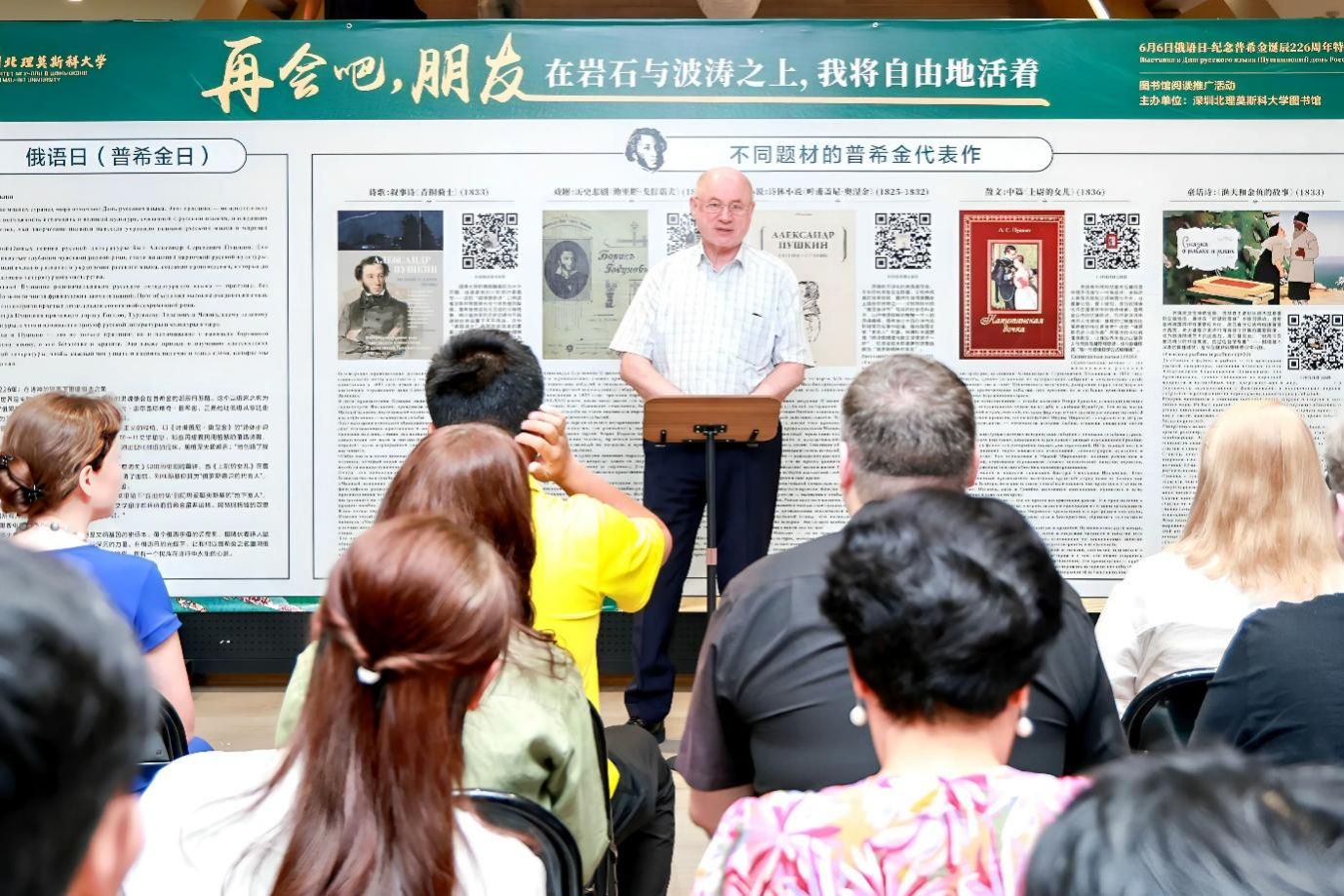 6月5日,在普希金誕辰226周年來臨之際,深圳北理莫斯科大學(xué)圖書館精心策劃的“俄語日——紀(jì)念普希金誕辰226周年展”在圖書館一樓盛大開幕。第一副校長謝爾蓋·伊萬琴科、語言系系主任亞歷山大·列杰涅夫以及師生代表齊聚現(xiàn)場,共同開啟了一場跨越時(shí)空的文學(xué)之旅,感受俄國文學(xué)巨匠的永恒魅力。
