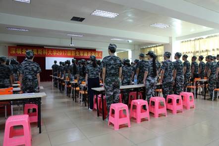 全體起立,在莊嚴的國歌聲中,2017級本科生以筆直的站姿為開訓儀式拉開帷幕。