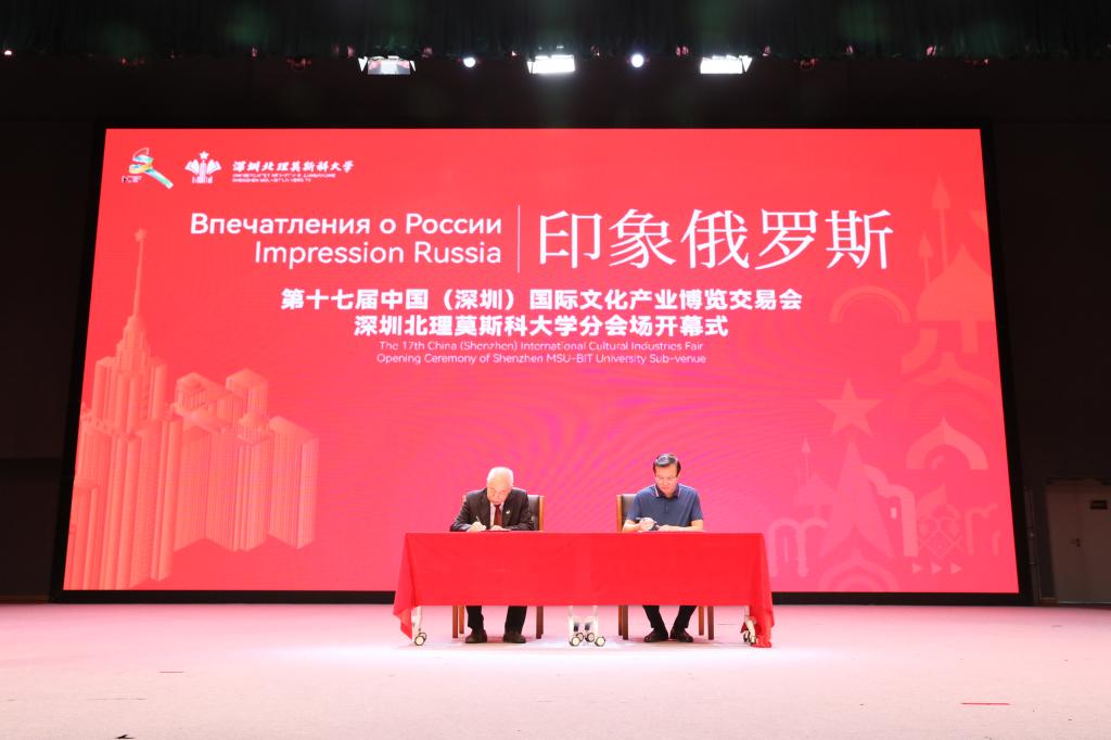 9月23日下午,印象俄羅斯——第十七屆中國(深圳)國際文化產業博覽交易會深圳北理莫斯科大學分會場開幕式在學校禮堂舉行。龍崗區文化廣電旅游體育局副局長李震,深圳職業技術學院校長許建領,深圳技術大學黨委副書記、紀委書記張巖鴻,深圳信息職業技術學院副校長周彥兵,中國國際象棋協會主席、國際象棋特級大師葉江川,深圳棋院院長劉適蘭,中國棋院國際跳棋和五子棋部主任、圍棋職業九段張文東,象棋特級大師、象棋女子世界冠軍王琳娜以及各高校、協會及企業相關領導及代表出席開幕式。參加開幕式的還有深圳北理莫斯科大學校長李和章,黨委書記、副校長朱迪儉,黨委副書記、紀委書記陳超峰和師生代表,以及深圳信息職業技術學院學生代表。
