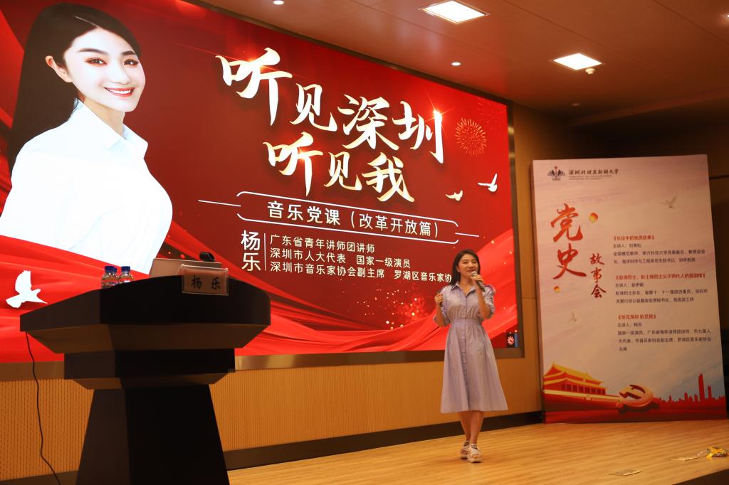 楊樂則以“聽見深圳 聽見我”為題,用音樂形式生動講解了深圳經濟特區改革發展歷程中的故事。她從一名音樂工作者的角度,結合個人成長經歷和特區發展歷史,將理論宣講與歌曲演唱有機結合起來,通過不同時期的代表音樂作品這一“小切口”,回顧和展現了當時黨的重大決策和社會經濟發展面貌的“大主題”,帶領大家深切感受黨的光輝歷史,重溫初心使命,堅定不移走中國特色社會主義道路,奮力建設好先行示范區。