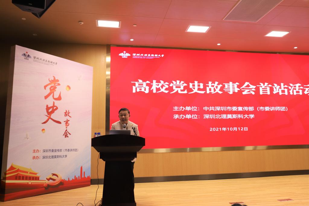 為深入學習貫徹習近平總書記“七一”重要講話精神,推動黨史學習教育走深走實,2021年10月12日,由市委宣傳部(市委講師團)主辦的高校黨史故事會首站活動在深圳北理莫斯科大學舉行。市委宣傳部二級巡視員、深圳創新創意設計發展辦公室主任韓望喜致辭,黨委書記、副校長朱迪儉,市委講師團團長、《文化深圳》主編史學正,以及學校相關部門負責人、思政課教師、輔導員和德育導師代表、學生代表近200人參加活動。