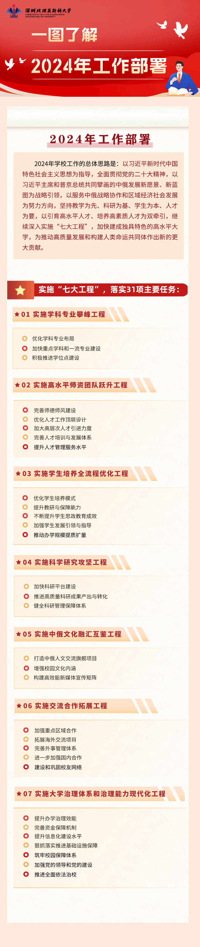 報告指出,2024年學校工作的總體思路是:以習近平新時代中國特色社會主義思想為指導,全面貫徹黨的二十大精神,以習近平主席和普京總統(tǒng)共同擘畫的中俄發(fā)展新愿景、新藍圖為戰(zhàn)略引領,以服務中俄戰(zhàn)略協(xié)作和區(qū)域經(jīng)濟社會發(fā)展為努力方向,堅持教學為先、科研為基、學生為本、人才為要,以引育高水平人才、培養(yǎng)高素質人才為雙牽引,繼續(xù)深入實施“七大工程”,加快建成獨具特色的高水平大學,為推動高質量發(fā)展和構建人類命運共同體作出新的更大貢獻。報告圍繞實施學科專業(yè)攀峰工程、高水平師資團隊躍升工程、學生培養(yǎng)全流程優(yōu)化工程、科學研究攻堅工程、中俄文化融匯互鑒工程、交流合作拓展工程、大學治理體系和治理能力現(xiàn)代化工程“七大工程”31項任務進行詳細部署。