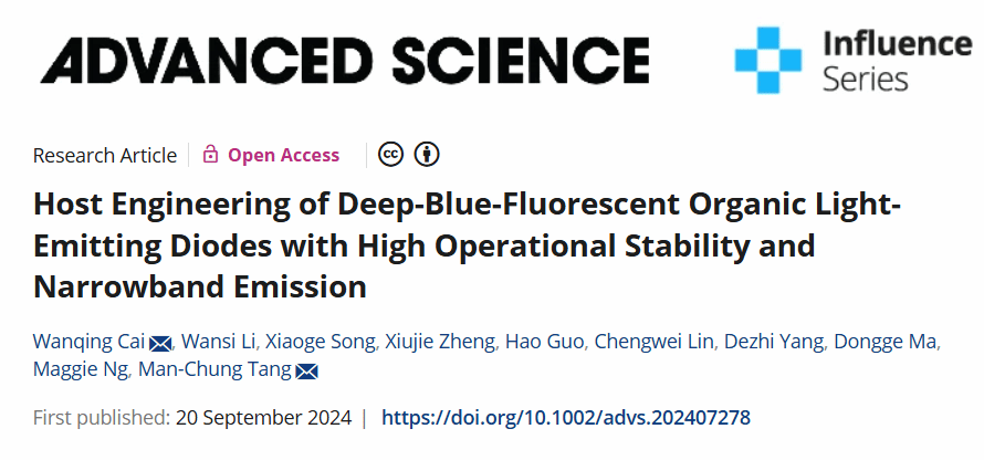 近日,深圳北理莫斯科大學材料科學系高級講師蔡萬清在期刊《Advanced Science》(中國科學院一區TOP期刊,IF:14.3)上發表了題為“Host Engineering of Deep-Blue-Fluorescent Organic Light-Emitting Diodes with High Operational Stability and Narrowband Emission”的研究論文(DOI: 10.1002/advs.202407278)。《Advanced Science》是跨學科的高影響力期刊,專注于材料科學、化學、生物科學和工程領域的創新研究。蔡萬清為本論文第一作者兼通訊作者,深圳北理莫斯科大學為第一通訊單位。論文合作作者包括清華大學深圳國際研究生院鄧敏聰副教授、華南理工大學發光材料與器件國家重點實驗室馬東閣教授、楊德智副研究員。