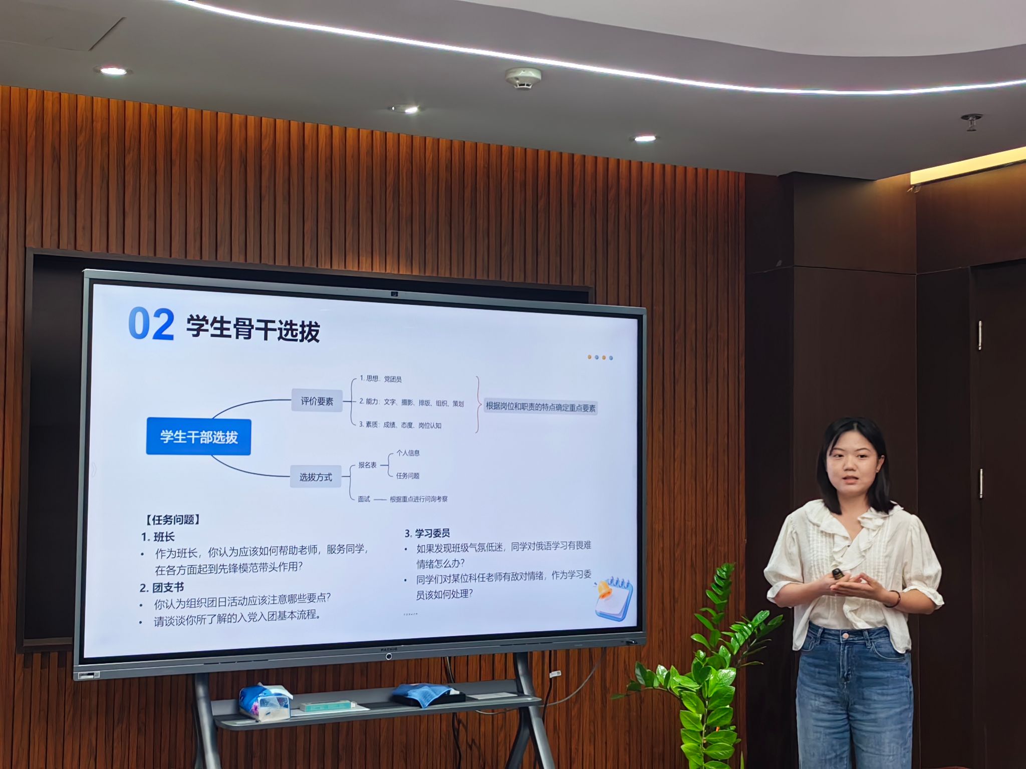 肖園以“學(xué)生骨干成長”為主題進行分享交流。她結(jié)合在校工作實際,細(xì)化學(xué)生骨干類別,用思維導(dǎo)圖的形式梳理學(xué)生骨干選拔到任用的重點要素,同時也指出學(xué)生骨干中容易出現(xiàn)功利心、官僚化、能力差等三大問題。她在分享中表示,學(xué)生骨干培養(yǎng)也是一種教育手段,對于學(xué)生骨干要帶領(lǐng)他們發(fā)掘內(nèi)心沖動、學(xué)習(xí)工作技能、尋找個人位置、實現(xiàn)自我價值、收獲獲得感,陪伴他們更好地成長。