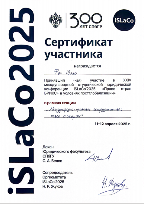 4月11日-12日,由圣彼得堡國立大學法律系主辦的國際學生法律會議“iSLaCo2025”在俄羅斯圣彼得堡舉行,會議主題為“‘金磚國家+’后全球化時代的法律發展”。在深圳北理莫斯科大學法學中心教師楊天放的指導下,法學中心碩士研究生馮鈺垚的論文摘要《金磚國家國際法律合作:制度機制、挑戰與創新戰略》通過組委會評審篩選,并于第五分會場做學術報告。該分會場評審人為圣彼得堡國立大學法律系國際法教研室教授I.S.馬魯辛,法學中心研究生張益瑋到場旁聽。