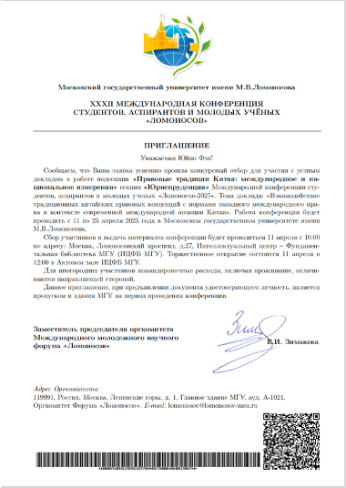 4月19日,由莫斯科國立大學主辦的第三十二屆國際學生、研究生及青年學者學術會議“羅蒙諾索夫”會議在莫斯科舉行。在法學中心教授V.L.托爾斯蒂赫的指導下,馮鈺垚的論文摘要《中國法律傳統與西方國際法的融合:全球治理視角下的中國方案》通過評審,獲邀在法學分會場“中國法律傳統”子議題中進行口頭報告,評議人為莫斯科大學法律系國際法教研室主任O.V.卡德舍娃。