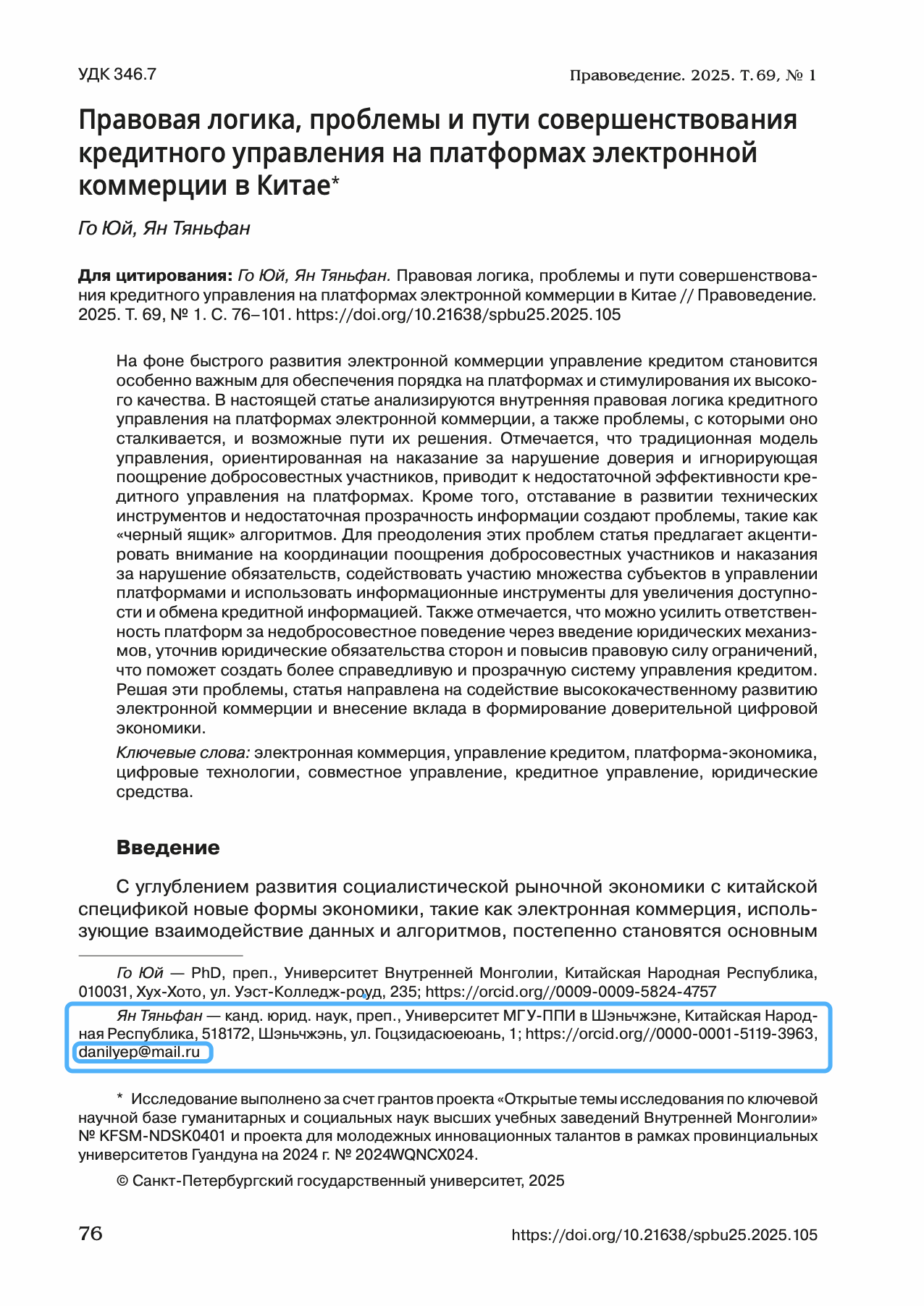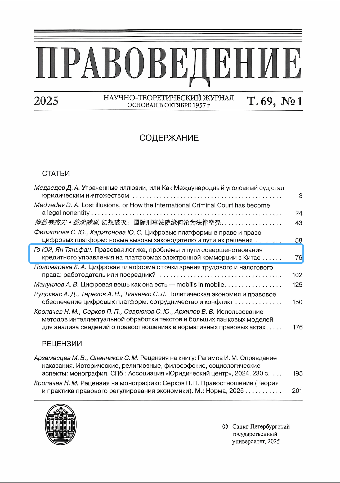 近日,由深圳北理莫斯科大學(xué)中俄法學(xué)比較研究中心楊天放老師與內(nèi)蒙古大學(xué)法學(xué)院郭宇老師聯(lián)合撰寫(xiě)的論文《中國(guó)電子商務(wù)平臺(tái)信用治理的法律邏輯、問(wèn)題與完善路徑》(俄文原題:《Правовая логика, проблемы и пути совершенствования кредитного управления на платформах электронной коммерции в Китае》)在俄羅斯頂級(jí)法學(xué)期刊《Правоведение》(法學(xué),2025年第1期)正式發(fā)表,為該期第五篇文章。楊天放為論文的并列第一作者、通訊作者。