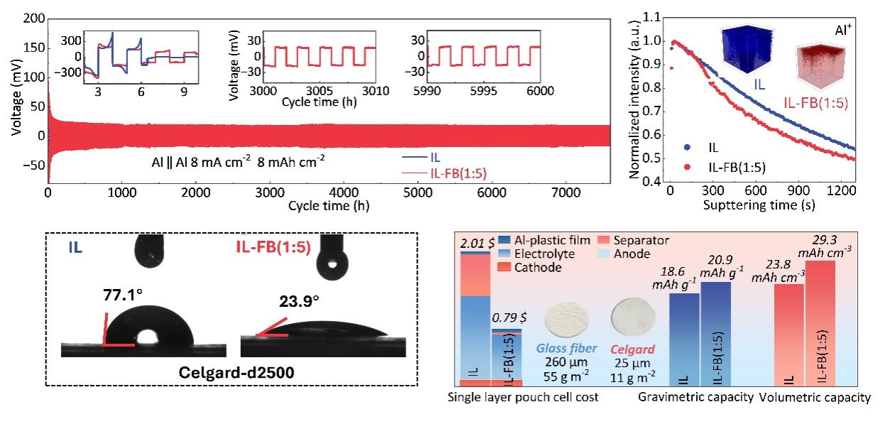 使用復合電解液的Al||Al對稱電池在8 mA cm-2 8 mAh cm-2的大電流密度和容量下可以循環7500小時以上,創下鋁負極性能記錄。界面表征結果顯示鋁表面會形成富含氟化鋁和離子分解產物的穩定固體電解質界面,抑制副反應。由于表面張力下降,復合電解液對聚丙烯隔膜的浸潤性極大提升,使得鋁離子電池可以與低成本的商用聚丙烯隔膜兼容,對比傳統玻璃纖維隔膜的鋁離子電池成本下降60%,為鋁離子電池走向實用化提供了關鍵技術支持。