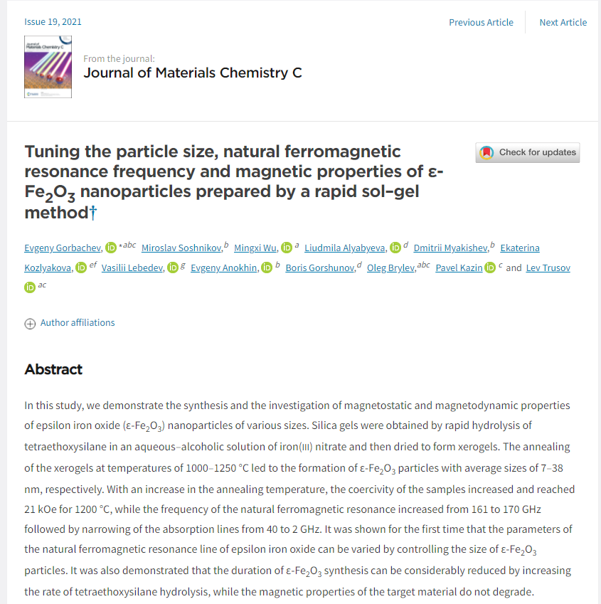 近日,在深圳北理莫斯科大學材料科學系主任O.A.Brylev、教師E.A.Gorbachev以及L.A.Trusov的指導帶領下,材料科學系大四年級學生吳明熹的科研課題取得了良好的研究成果,其合作撰寫的論文“Tuning the particle size, natural ferromagnetic resonance frequency and magnetic properties of ε-Fe2O3nanoparticles prepared by a rapid sol–gel method”于2021年4月份在期刊《Journal of Materials Chemistry C》上發表并被選為期刊封面圖片,該期刊的影響因子(Impact factor,IF)為7.059。