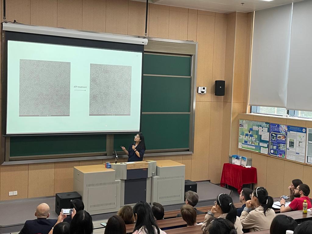 會議主辦方共選出10篇演講論文和10篇海報論文。碩士期間曾就讀于深圳北理莫斯科大學(xué)生物系納米生物方向,目前在香港中文大學(xué)(深圳)攻讀博士學(xué)位的王曦同學(xué)分享了她在兩所知名大學(xué)的成長經(jīng)歷,并匯報了其最新的課題研究成果,精彩的報告贏得了在場師生們的熱烈掌聲。