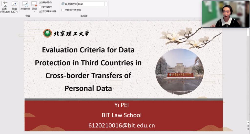 北京理工大學法學院助理教授裴軼老師以《個人數據跨境傳輸中第三國數據保護的評估標準》為題做報告,其對中國立法規制經驗的詳細介紹引發了與會人員及聽眾的熱烈討論。