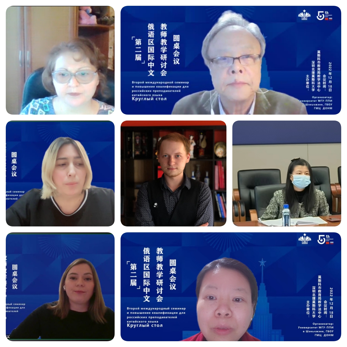 今年,深圳北理莫斯科大學和莫斯科市教育局教學法中心首次合作舉辦中俄圓桌會議。北京語言大學崔永華教授、天津惠靈頓外籍人員子女學校中文部周鴦主任、我校高級講師蔣夢晗博士、莫斯科國立第548“察里津諾”中學漢語教師瓦列里·謝爾蓋耶維奇、娜塔莉亞·瓦連京諾夫娜老師以及莫斯科國立第1948"Linguist-M"中學的加琳娜·魯斯蘭耶夫娜老師和葉卡捷琳娜·謝爾蓋耶夫娜老師,圍繞“現代漢語教學法及熱點問題研究”展開熱烈交流。