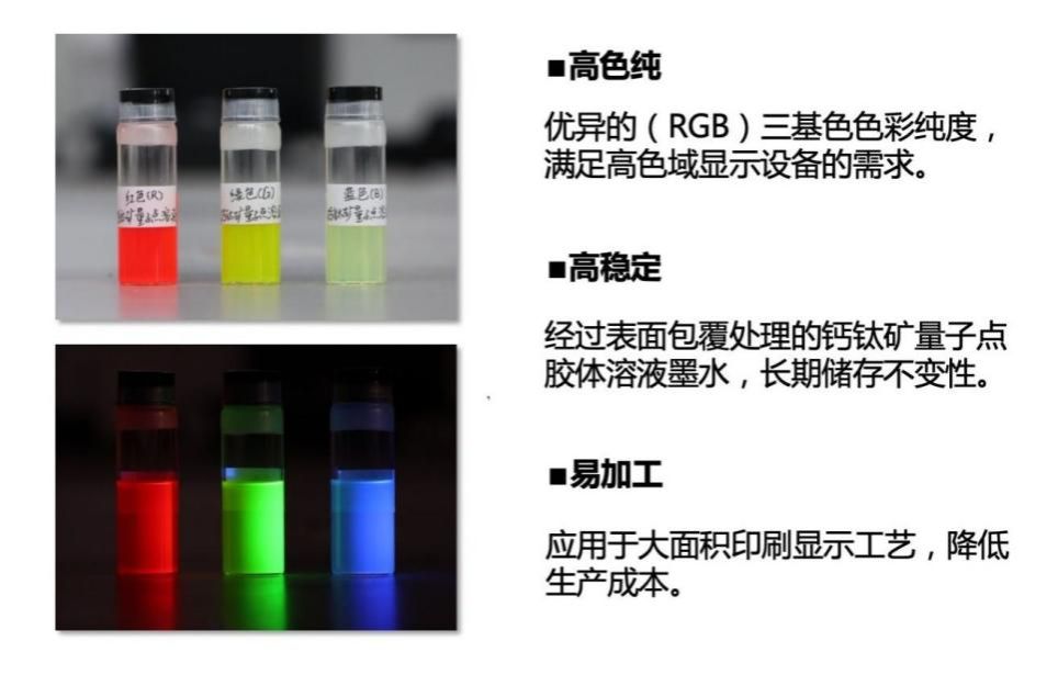 鈣鈦礦量子點(diǎn)印刷顯示墨水,由深圳北理莫斯科大學(xué)材料科學(xué)系常帥教授團(tuán)隊(duì)研發(fā)。該團(tuán)隊(duì)通過優(yōu)化鈣鈦礦量子點(diǎn)的制備方法,實(shí)現(xiàn)了可在溶液中穩(wěn)定儲存的鈣鈦礦量子點(diǎn)膠體溶液,使其能夠保持較長時間的保持光學(xué)性能和膠體穩(wěn)定性。這種墨水還具有優(yōu)異的色彩純度和熒光效率,與傳統(tǒng)量子點(diǎn)材料相比具有低毒性、低成本等明顯優(yōu)勢,開創(chuàng)了鈣鈦礦材料在印刷顯示領(lǐng)域的應(yīng)用新路徑。