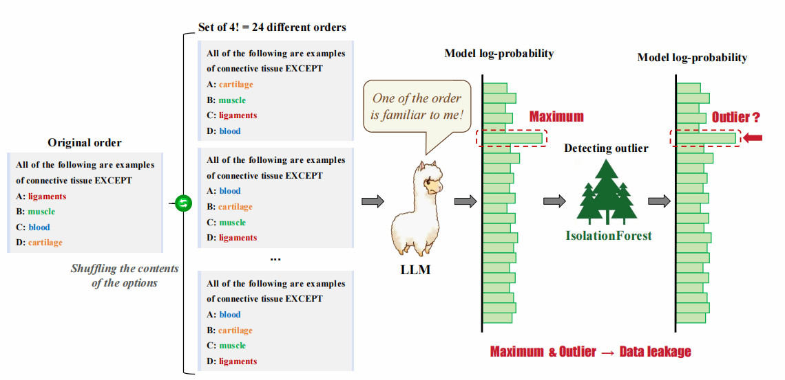 大規模語言模型(LLMs)的成功在很大程度上依賴于在預訓練階段學習到的大量預訓練數據。預訓練過程及其數據的不透明性導致許多基準測試的結果變得不可靠。如果任何模型已經在基準測試集上進行了訓練,這可能會嚴重阻礙該領域的健康發展。為了自動化和高效地測試大規模語言模型的能力,許多主流基準測試采用了多項選擇題的格式。由于多項選擇題選項內容的交換不影響問題本身的含義,該研究提出了一種基于這一特性的簡單有效的數據泄露檢測方法。具體來說,研究通過打亂數據中選項的內容來生成相應的衍生數據集,然后基于模型在這些衍生數據集上的對數概率分布檢測數據泄露。如果在對數概率的集合中存在最大值或異常值,便表示數據發生了泄露。該論文研究的方法能夠在黑盒條件下工作,無需訪問模型的訓練數據或權重,有效識別模型預訓練數據中來自基準測試集的數據泄露,包括正常情況以及選項可能被有意或無意地打亂的復雜情況。通過基于兩種大規模語言模型和基準設計的實驗,該研究展示了該方法的有效性。此外,研究還評估了31個主流開源大規模語言模型在四個基準數據集上的數據泄露程度,并對每個基準數據集中的泄露模型進行了排名,發現Qwen家族的大規模語言模型泄露程度最高。