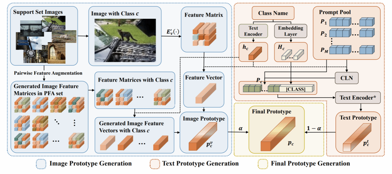 由于注釋數據有限和類別特異性難以捉摸,多標簽少樣本圖像分類是一項至關重要且極具挑戰性的任務。然而,對這一課題的研究仍處于初級階段,可用的方法很少。現有的方法要么利用數據增強來緩解數據稀缺的問題,要么利用標簽特征作為輔助知識來消除不相關類別帶來的負面影響,但它們忽視了利用圖像區域特征進行數據增強,也忽略了學習適當的文本特征來更好地匹配特定類別的圖像特征。此外,這些方法只關注了一個方面,沒有同時有效地解決上述兩個問題。本文介紹了一種新穎的基于原型的多標簽少樣本圖像學習框架,它將成對特征增強和靈活的提示學習結合在一起。具體來說,通過成對特征增強,利用支持集中圖像的區域特征來生成更多圖像特征并構建圖像原型,從而緩解了數據稀缺的問題。通過靈活的提示學習,自適應地獲取特定類別的提示,構建與特定類別圖像特征高度匹配的文本原型,從而減輕無關類別的影響。最后,通過自適應可學習參數,將圖像原型和文本原型合并,得到最終原型,從而為多標簽少樣本圖像分類提供更強大的分類器。廣泛的實驗結果表明,這一研究提出的方法可以將基準性能推向更高水平。