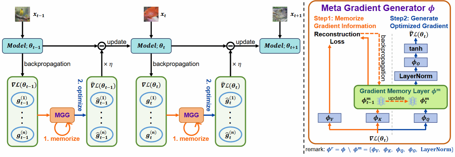 測試時自適應(TTA)旨在使用未標記的測試數據在線微調已訓練好的模型,以適應新環境或分布外的數據,在實際場景中表現出廣泛的應用潛力。然而,在這個優化過程中,像熵最小化這樣的無監督學習目標經常會遇到嘈雜的學習信號。這些信號產生不可靠的梯度,阻礙了模型快速收斂到最優解的能力,并在優化過程中引入了顯著的不穩定性。本研究試圖從優化器設計的角度解決這些問題。與之前使用 SGD 等手動設計的優化器的TTA方法不同,我們采用一種學習優化的方法來自動學習一個稱為元梯度生成器(MGG)的優化器。具體來說,研究的目標是讓MGG在在線優化過程中有效利用歷史梯度信息來優化當前模型。為此,在MGG中,我們設計了一個輕量級且高效的序列建模層——梯度記憶層。它利用自監督重構損失將歷史梯度信息壓縮為網絡參數,從而在長期適應過程中實現更好的記憶能力。只需要少量未標記的樣本來預訓練MGG,就可以部署訓練后的MGG來處理未見過的樣本。ImageNet-C/R/Sketch/A上的實驗結果表明,這一研究的方法以更少的更新次數、更少的數據和更短的自適應時間超越了當前最先進的方法。與之前的SOTA方法SAR相比,本文的研究在ImageNet-C上實現了7.4%的準確率和4.2倍的適應速度提升。