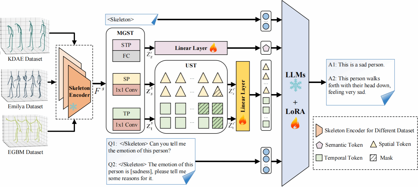 基于肢體動作的情感識別在人機交互中至關重要。然而,現有方法主要聚焦于情感分類,不能進一步提供文本解釋來驗證其分類的合理性。本文提出了一個由大語言模型驅動的情緒-動作解釋器(EAI-LLM),它不僅可以識別情緒,還可以針對輸入的3D骨架序列來生成相應的文本解釋。具體而言,研究將骨架序列視為一種特殊的語言,提出一種多粒度骨架序列標記器。該標記器可以將來自異構數據集的骨架序列統一提取時空標記和語義標記,利用LLMs廣泛的背景知識和語言處理能力來解決異構數據集聯合訓練的挑戰,從而顯著提高識別精度,并生成細粒度的情感描述。實驗結果表明,在LLMs背景知識的支持下,EAI-LLM模型可以在有限標記的骨架序列上進行微調,生成詳細的情緒描述,且識別精度與現有方法相當甚至更佳。
