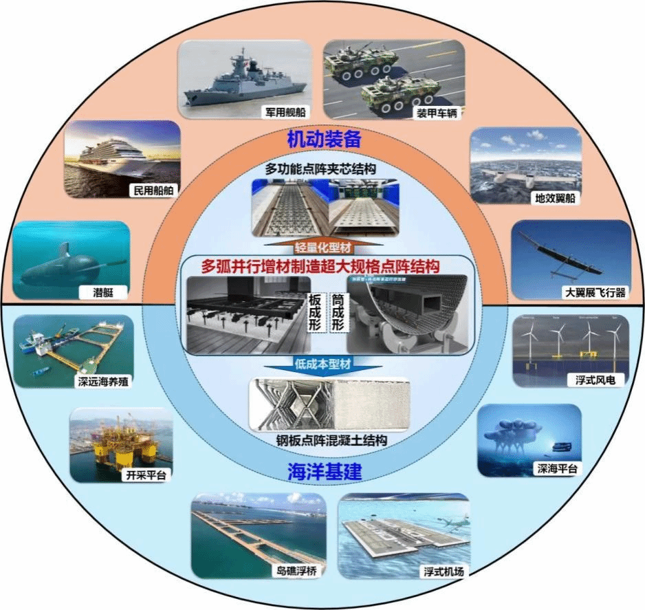 海洋裝備在現代國家的國防和經濟發展中扮演著關鍵角色。船舶等海洋載運裝備在輕量化需求基礎上,對防爆、防撞等功能需求愈發迫切。海洋浮式平臺等海洋資源(深遠海風電等)開發裝備傳統鋼結構制造成本昂貴,亟需開發低成本、模塊化、高性能且制造周期短的浮式平臺制造新型材料。增材制造技術為海洋裝備結構創新提供了契機:(1)增材制造大型鋼板點陣結構的制造,滿足船舶對輕質和多功能的需求;(2)增材制造點陣夾芯結構間隙中復合混凝土,形成鋼板點陣混凝土結構,顯著降低浮式平臺的建造成本。然而,針對海洋裝備數十米級大尺寸構件高性能制造的需求,仍然需要提高成型尺寸、精度和效率,移動式增材制造機器人和多機協同技術可實現大尺寸構件高效率增材制造,激光電弧復合與協同工藝可顯著提升精度和性能場景適用性,為實現海洋裝備超大型結構創新設計與制造奠定基礎。