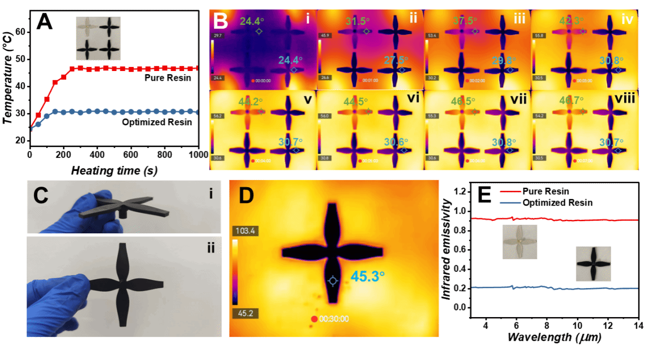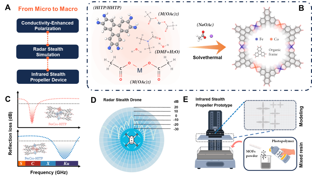 此外,通過光固化3D打印導電MOFs材料構建的螺旋槳器件同時具備微波吸收與紅外輻射抑制功能,最大雷達散射截面(RCS)衰減達-23.3 dB㎡,紅外發射率低至0.203;在100 °C加熱平臺下持續加熱30 min后,其表面溫度仍維持在50? ℃以下,展現出優異的熱管理性能與環境穩定性。所研發的功能化器件可作為無人機關鍵部件,增強其在強電磁干擾、多頻譜探測等復雜環境下的隱蔽性與任務可靠性。該研究構建了一條從分子尺度設計到宏觀器件制造的全流程技術路徑,為下一代高性能雷達/紅外雙頻譜兼容隱身器件的設計、工藝及工程化應用提供了參考路徑,同時也深化了對導電MOFs電磁性能調控機制的理解,為MOFs材料在多功能隱身領域的拓展應用提供了理論支撐。