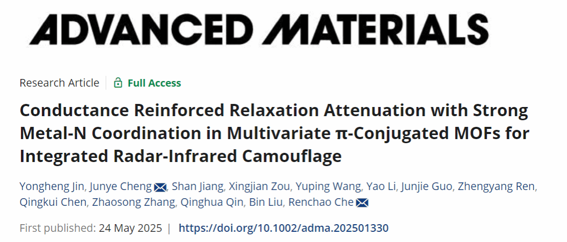 近日,深圳北理莫斯科大學材料科學系副教授程俊業指導的北京理工大學深北莫專項碩士研究生金永衡同學,以深北莫為第一單位,其本人為第一作者在《Advanced Materials》期刊發表題為《Conductance Reinforced Relaxation Attenuation with Strong Metal-N Coordination in Multivariate π-Conjugated MOFs for Integrated Radar-Infrared Camouflage》的研究論文。參與本次研究工作的還有深北莫材料科學系本科生江山、鄒行健、郭俊杰、任正揚,以及北京理工大學深北莫專項碩士研究生陳慶奎、博士研究生張照松。復旦大學車仁超教授為該研究提供了材料表征技術支持。