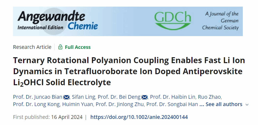 近日,深圳北理莫斯科大學材料科學系教師卞均操在全固態電池領域取得重要進展,報道了一種三元聚陰離子的旋轉耦合機制,可有效地促進固態電解質中鋰離子的傳輸。相關成果以“Ternary Rotational Polyanion Coupling Enables Fast Li Ion Dynamics in Tetrafluoroborate Ion Doped Antiperovskite Li2OHCl Solid Electrolyte”為題發表于國際頂級期刊《Angewandte Chemie International Edition》上。深圳北理莫斯科大學為第一通訊單位,卞均操為本文第一作者兼通訊作者,汕頭大學教師鄧貝、寧波東方理工大學(暫名)教師趙予生和南方科技大學教師盧周廣為共同通訊作者。