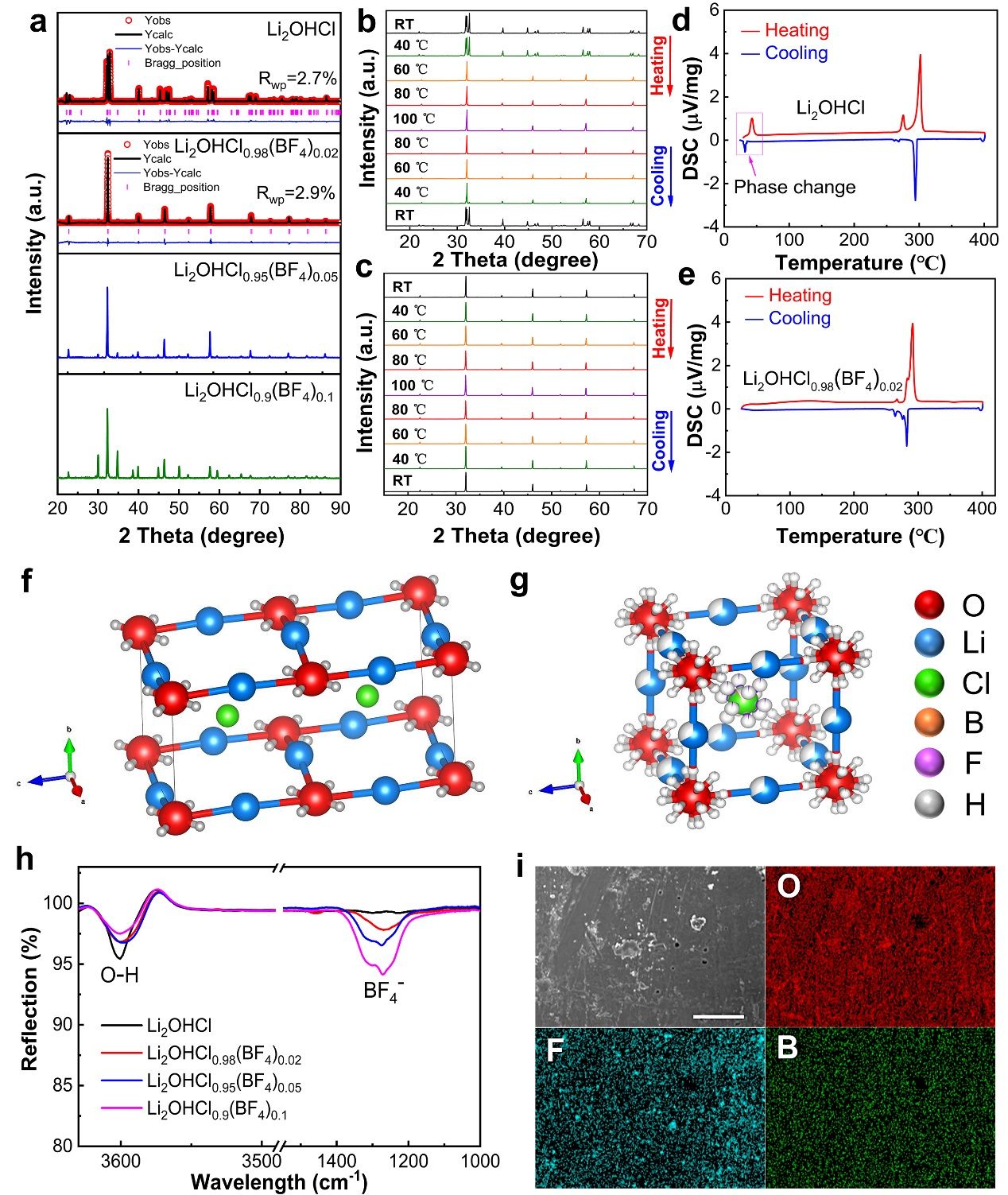 全固態鋰金屬電池具有較高的理論能量密度和安全性,被業界認為是最有希望的下一代電池技術之一。在眾多的固態電解質材料中,富鋰反鈣鈦礦型羥基鹵氧化物憑借易合成、低成本和易于擴大生產等優勢,被視為具有潛在的實際應用前景。但為了推動其實際應用,仍需對富鋰反鈣鈦礦固態電解質的電化學性能進行持續優化。有研究人員發現,在含有聚陰離子的固態電解質中,鋰離子的傳輸與聚陰離子的旋轉和重新定向運動密切相關,這增強了鋰離子電導率并降低活化能。然而,目前含有聚陰離子的富鋰反鈣鈦礦固態電解質在文獻中還少見報道,聚陰離子對LiRAP的電化學性能和鋰離子傳輸的影響仍然有待探索。本文發現在Li2OHCl中適當摻雜BF4-可以有效地提升鋰離子電導率,降低活化能,降低電子電導率,增強材料對鋰金屬的電化學穩定性。