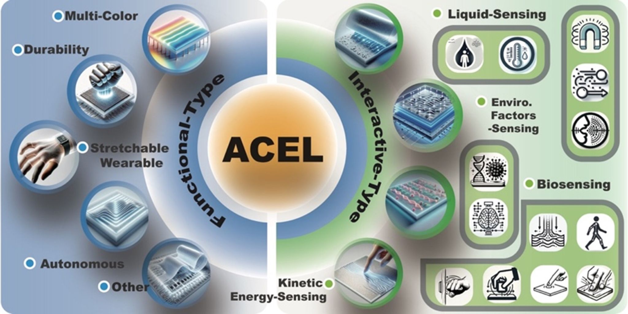 該綜述論文詳細討論了與交流電致發光(ACEL)有關的三種機制:激子復合機制、熱電子碰撞或離化激發機制和場致驅動電離激發機制;介紹了注入型、半注入型和非注入型器件所對應的器件結構和發光原理;討論了ACEL技術的最新優化策略,包括高效交流電驅動方法、多樣化制備方法以及先進材料選擇等方面。綜述重點介紹了ACEL技術在功能性顯示設備方面的最新進展,主要涵蓋:多色顯示技術,高耐久性顯示,可拉伸和可穿戴顯示,自供能、自修復和自降解功能顯示等。綜述進一步概述了交互型ACEL傳感顯示設備的發展和分類,主要包括液體傳感顯示、環境因素傳感顯示、動能傳感顯示和生物傳感顯示等,并總結了它們在感知不同交互反應并通過發光反饋作出響應的能力。最后,綜述展望了未來的功能型和交互型ACEL設備在人工智能、智能機器人、人機交互等領域面臨的挑戰和新機遇。