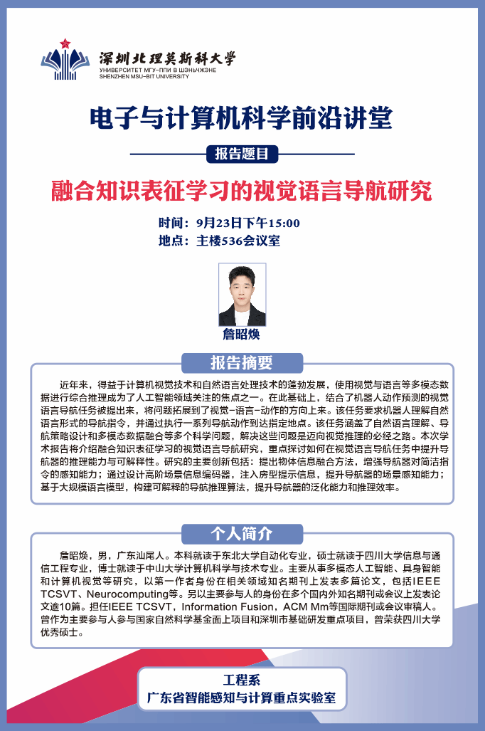 主講嘉賓簡介:詹昭煥,男,廣東汕尾人。本科就讀于東北大學(xué)自動化專業(yè),碩士就讀于四川大學(xué)信息與通信工程專業(yè),博士就讀于中山大學(xué)計算機科學(xué)與技術(shù)專業(yè)。主要從事多模態(tài)人工智能、具身智能和計算機視覺等研究,以第一作者身份在相關(guān)領(lǐng)域知名期刊上發(fā)表多篇論文,包括IEEE TCSVT、Neurocomputing等。另以主要參與人的身份在多個國內(nèi)外知名期刊或會議上發(fā)表論文逾10篇。擔(dān)任IEEE TCSVT,Information Fusion,ACM Mm等國際期刊或會議審稿人。曾作為主要參與人參與國家自然科學(xué)基金面上項目和深圳市基礎(chǔ)研發(fā)重點項目,曾榮獲四川大學(xué)優(yōu)秀碩士。