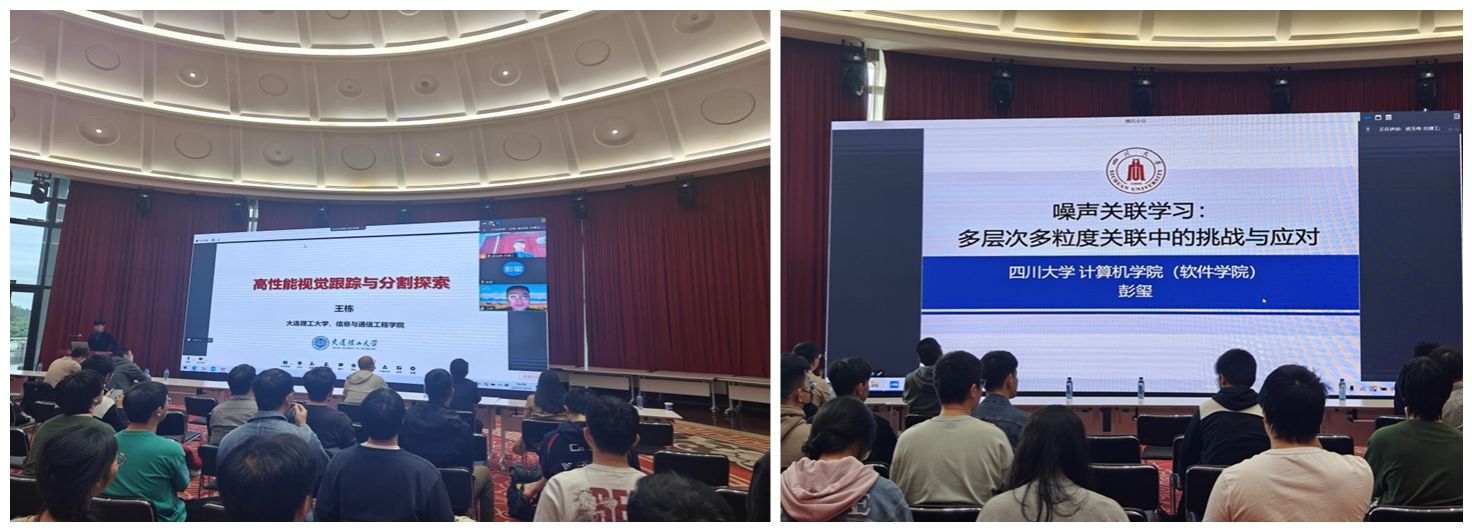 4位特邀講者圍繞智能感知與計算的前沿進展,分別做了深入噪聲關聯學習:多粒度關聯中的挑戰與應對”、“高性能視覺跟蹤與分割探索”、“深層概率分布建模網絡設計、理解及應用”和“低質目標增強與感知”的報告。四川大學彭璽教授的報告從不同粒度、不同層次的角度介紹了噪聲關聯學習的最新進展,分析其中的挑戰及解決策略。大連理工大學王棟教授的報告從模板和搜索區域特征融合、跟蹤分割協同及嵌入式平臺部署需求等方面介紹了高性能視覺跟蹤與分割的最新進展。中山大學任文琦教授針對成像過程中模糊、雨霧、低分辨率、低動態范圍等不同質量退化的成因,分別介紹了針對性的解決方案以及兼顧下游低質與偽裝目標檢測效果增益的圖像恢復算法。天津大學王旗龍教授的報告介紹了一類深層概率分布建模網絡,其旨在結合深度學習和概率機器學習增強深度模型的泛化性、魯棒性和可解釋性。