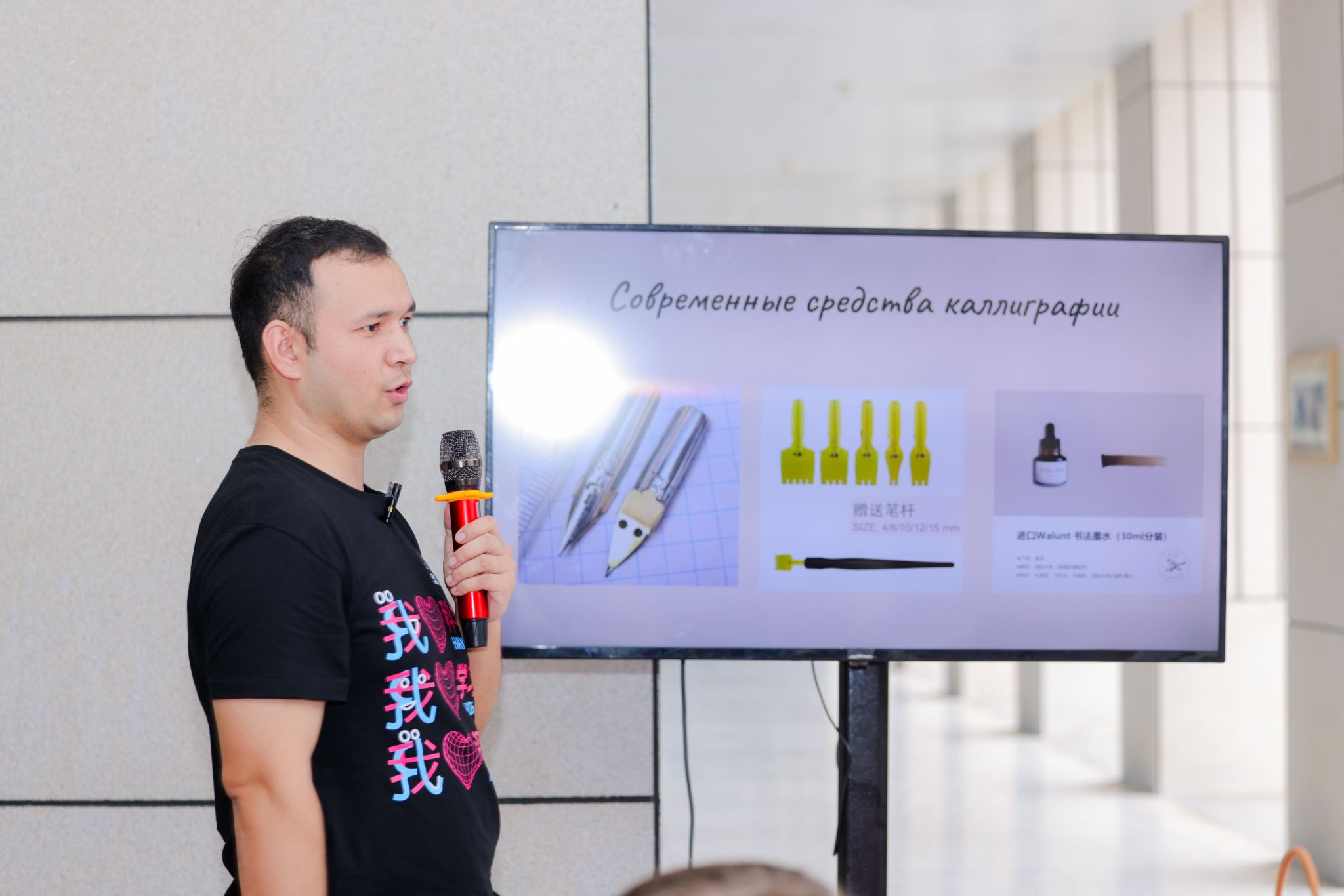 主講人介紹了現如今,在何時、何地可以看到古俄語字母,并用直觀的示例展示了古俄語字形至今仍然在使用。深北莫的師生及來賓聽得興致勃勃,不但了解了俄語書法的發展現狀,也知悉了一些當代的俄羅斯著名書法家。