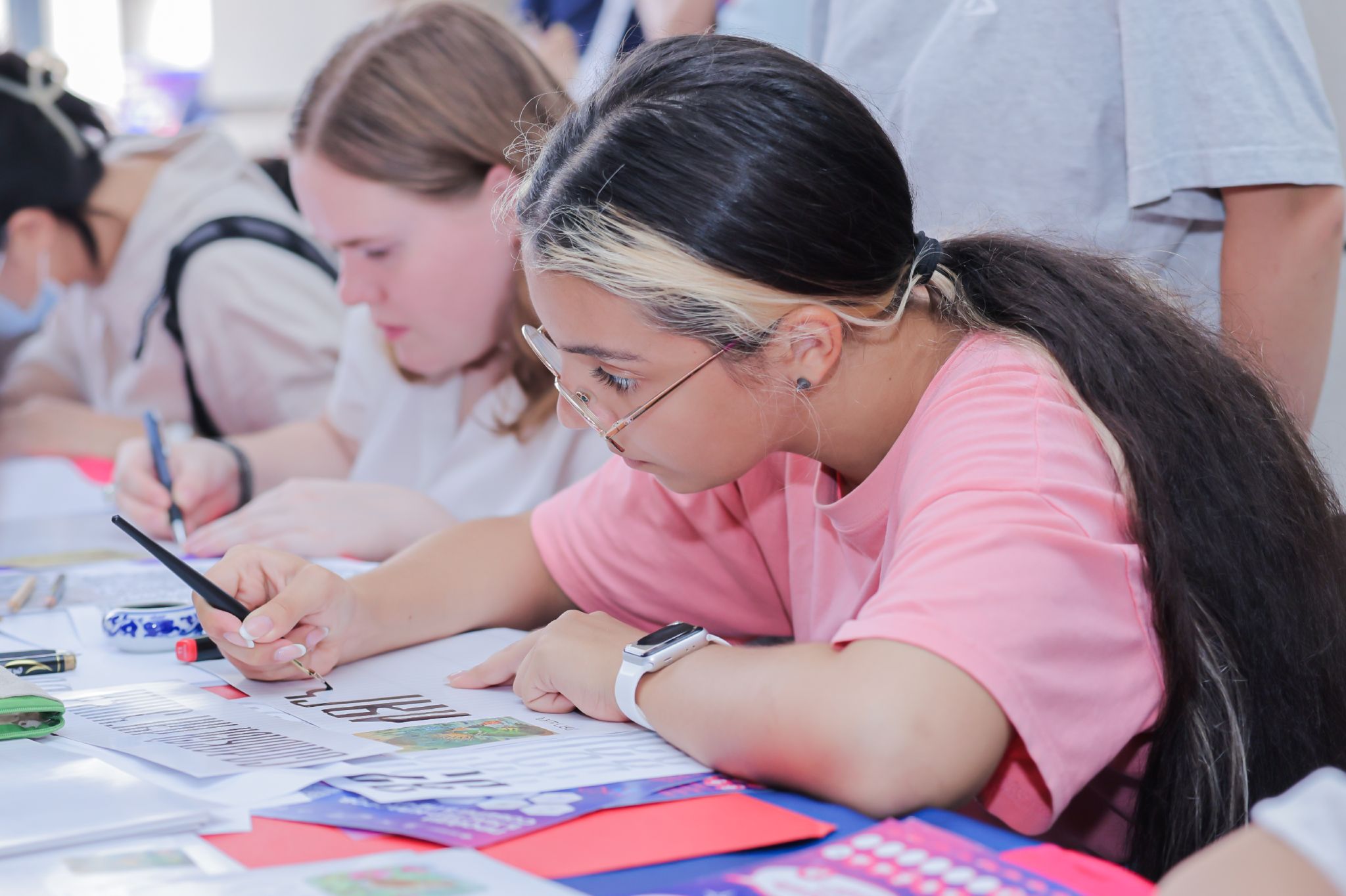隨后,在書法體驗課上,大家還參加了有趣的知識問答游戲。游戲中的問題涉及多角字體、簡化多角字體、草書、連字這些書寫技巧。體驗課的參與者特別喜歡《連字》的書寫技巧。連字在歷史上與其說是文字,更像是漂亮的字形字謎,經常被用做圖案裝飾,如被連字為《中國》一詞。學生們很快就猜出了所有謎底,并獲得了甜品獎勵。他們還得到了用于留念的手寫草書祝福卡。