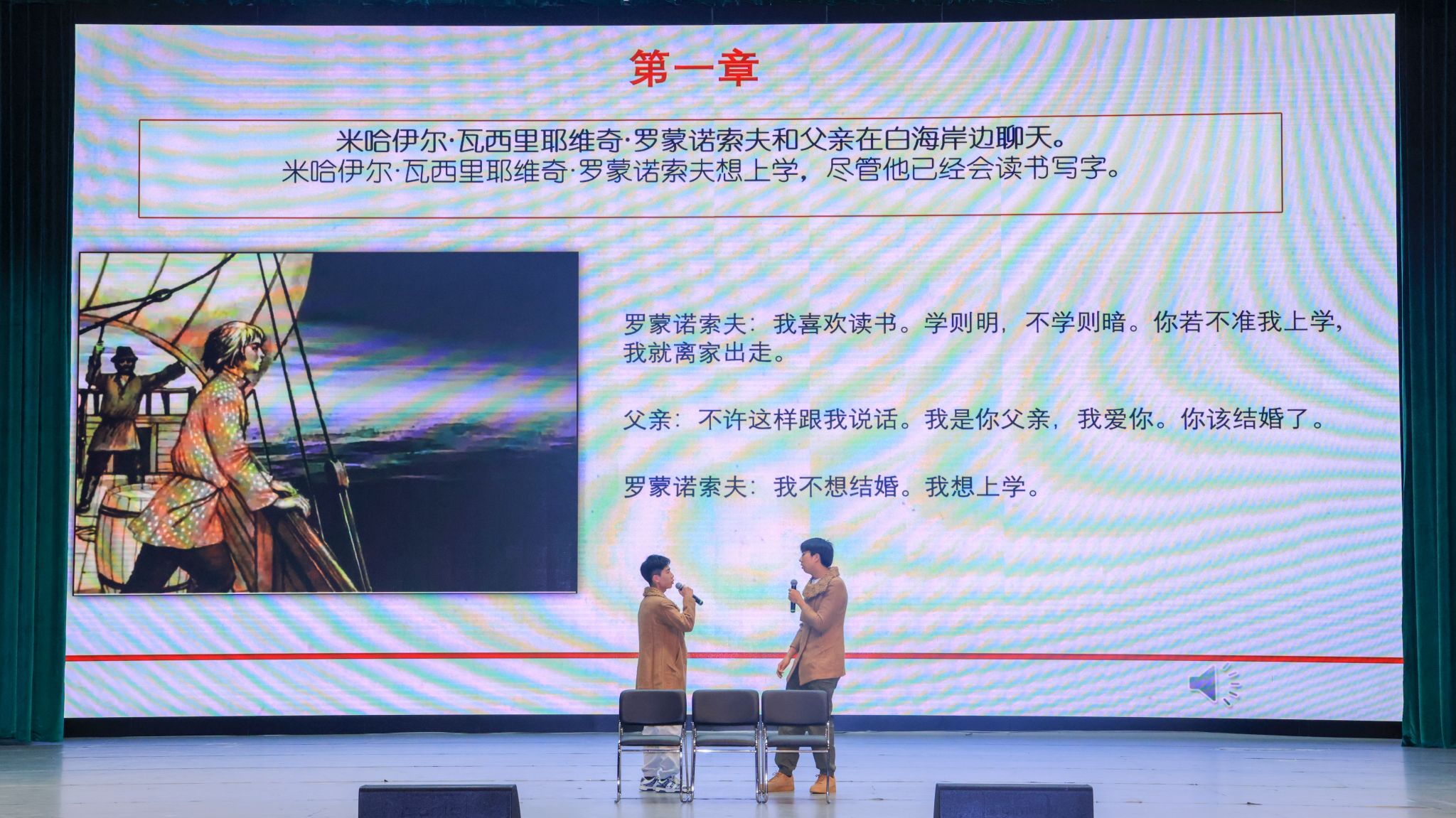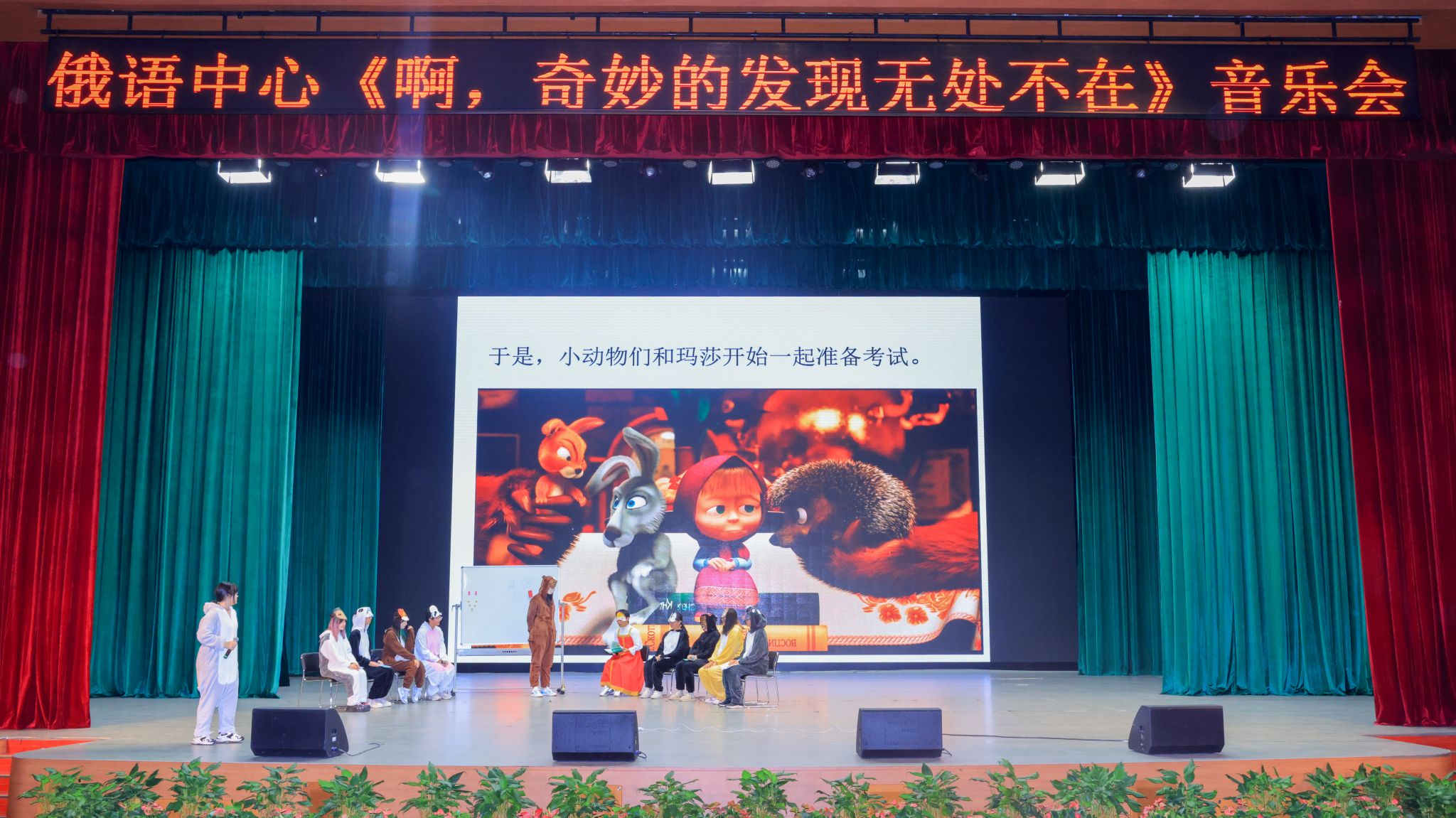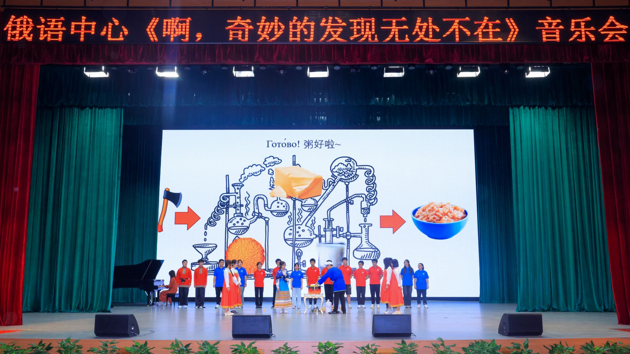 電影小組《注意:開機!》的同學們演唱了一首在中俄兩國都深受喜愛的歌曲《喀秋莎》,中俄雙語演唱的嘹亮歌聲響徹全場;國情文化小組《對話》把俄羅斯童話《斧子粥》改編成劇本搬上了舞臺,充分展現了同學們的表演和音樂才能。