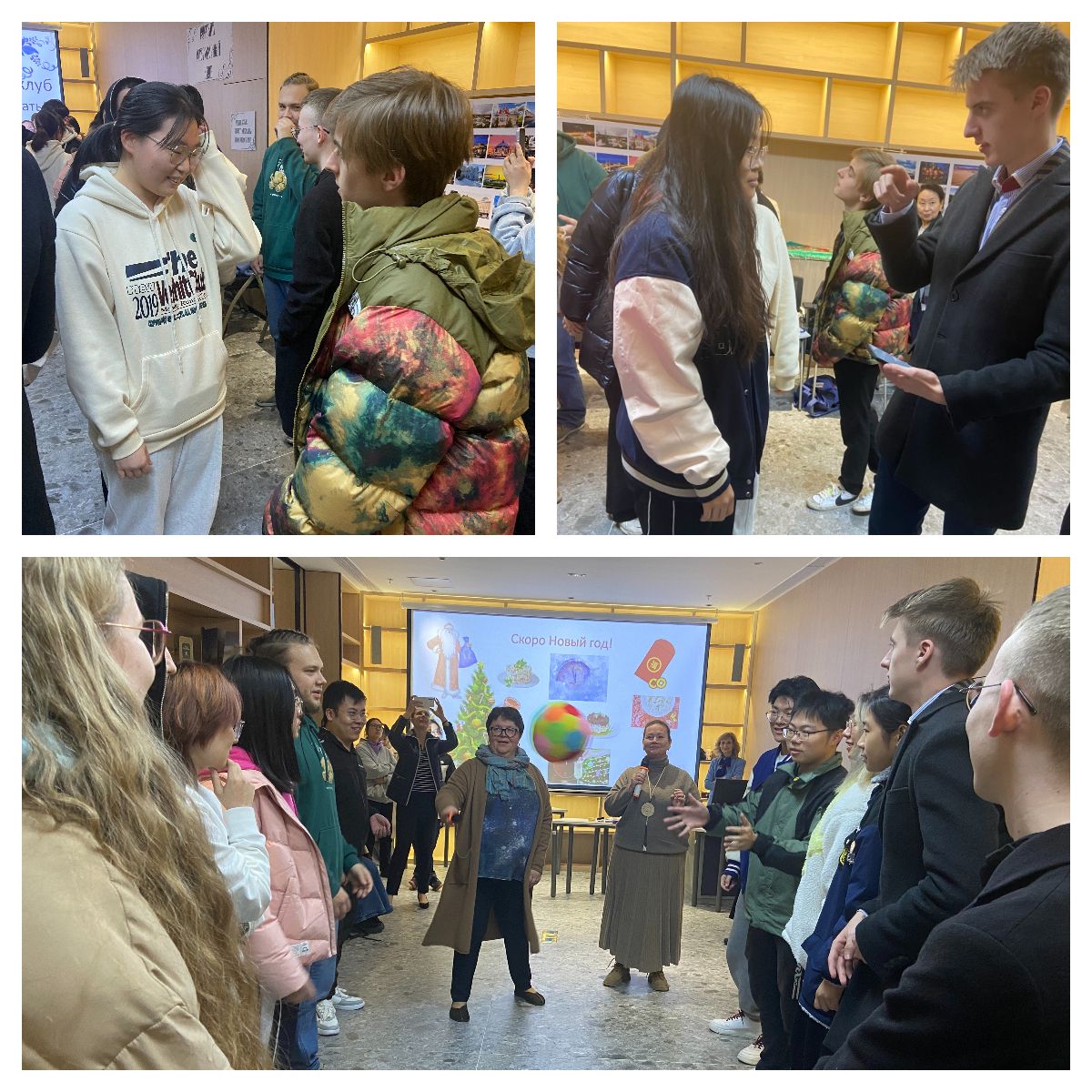 活動在歡樂的音樂聲中以圓圈舞游戲拉開序幕,同學們分別用俄語做了自我介紹,很快大家就融入到了一起。主持活動的俄羅斯老師在活動現場別出心裁地穿插了多個趣味游戲,比如:擊鼓傳花(球)、有獎問答、歡樂便利貼等,讓同學們都能參與其中,相互配合,相互協助共同完成任務,讓同學們在輕松愉快的氛圍中用俄語交流,感受俄羅斯文化。通過交流,不同系別、不同班級、不同國籍的同學們相互之間有了更深入的了解。活動結束時,不少同學還與俄羅斯留學生互相添加了微信,并表示今后將繼續互相交流、學習。