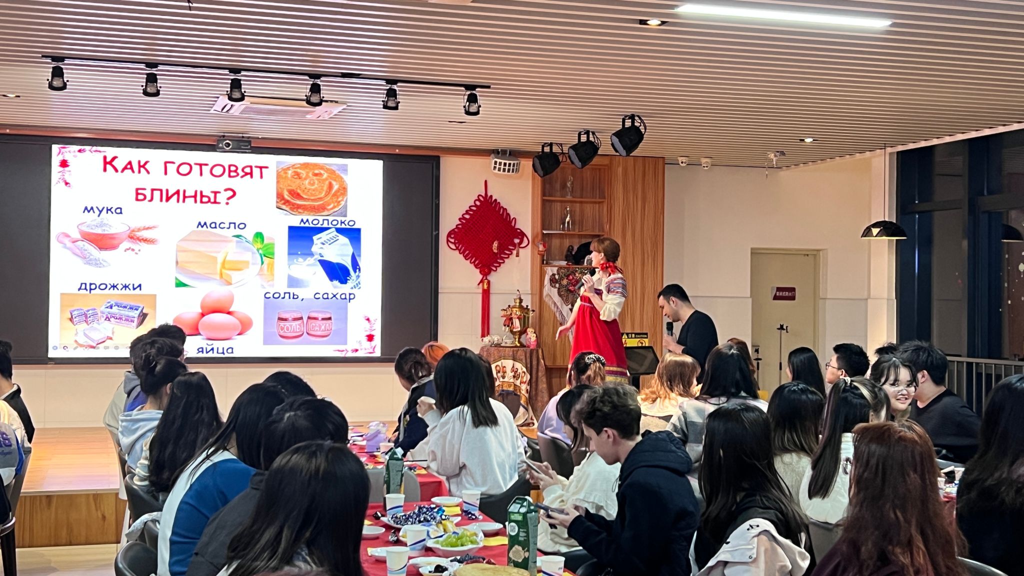 本次活動的主要目的是讓同學們了解“謝肉節”的傳統習俗。活動現場的舞臺一側掛著俄羅斯披肩,主持人身著俄羅斯民族服裝,餐桌上準備了豐富的俄羅斯茶炊。主持人首先向同學們介紹了“謝肉節”的歷史來源和意義:“謝肉節”的象征是太陽,節日的意義是迎接春天。同時還講述了“謝肉節”的習俗,比如,星期一被稱為“迎春日”,這一天人們制作謝肉節稻草人;星期二開始舉行一系列有趣的比賽;星期三通常會串門做客;星期四被稱為“狂歡日”,這一天將會舉辦盛大的活動,如“爬冰柱”“墻對墻”(眾人拳擊)等。通過主持人的講述,色彩鮮明的PPT展示及其靚麗的照片、民樂和有趣的視頻片段,同學們獲得了許多“謝肉節”的民俗知識,餐桌上的美味佳肴也給同學們留下了深刻的印象。
