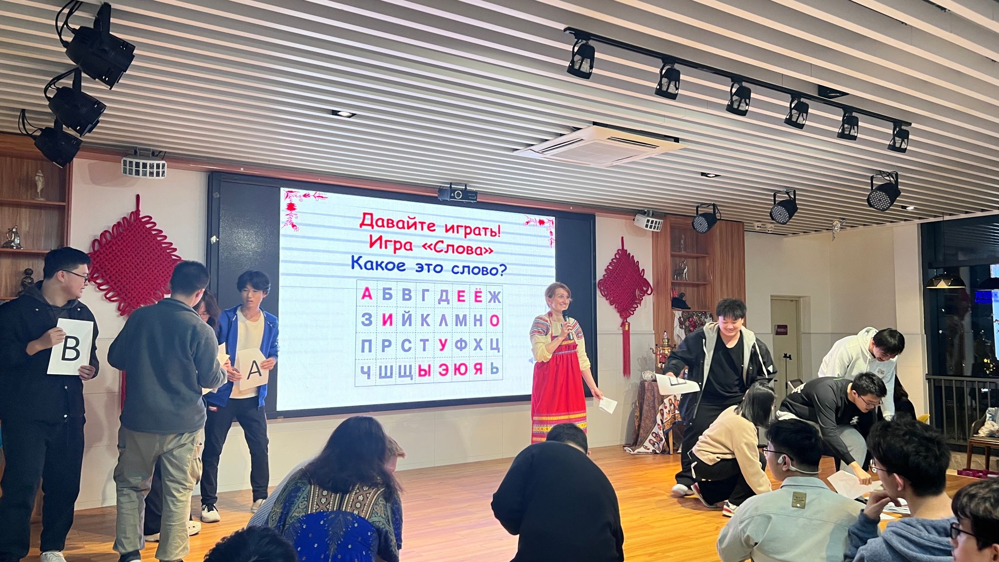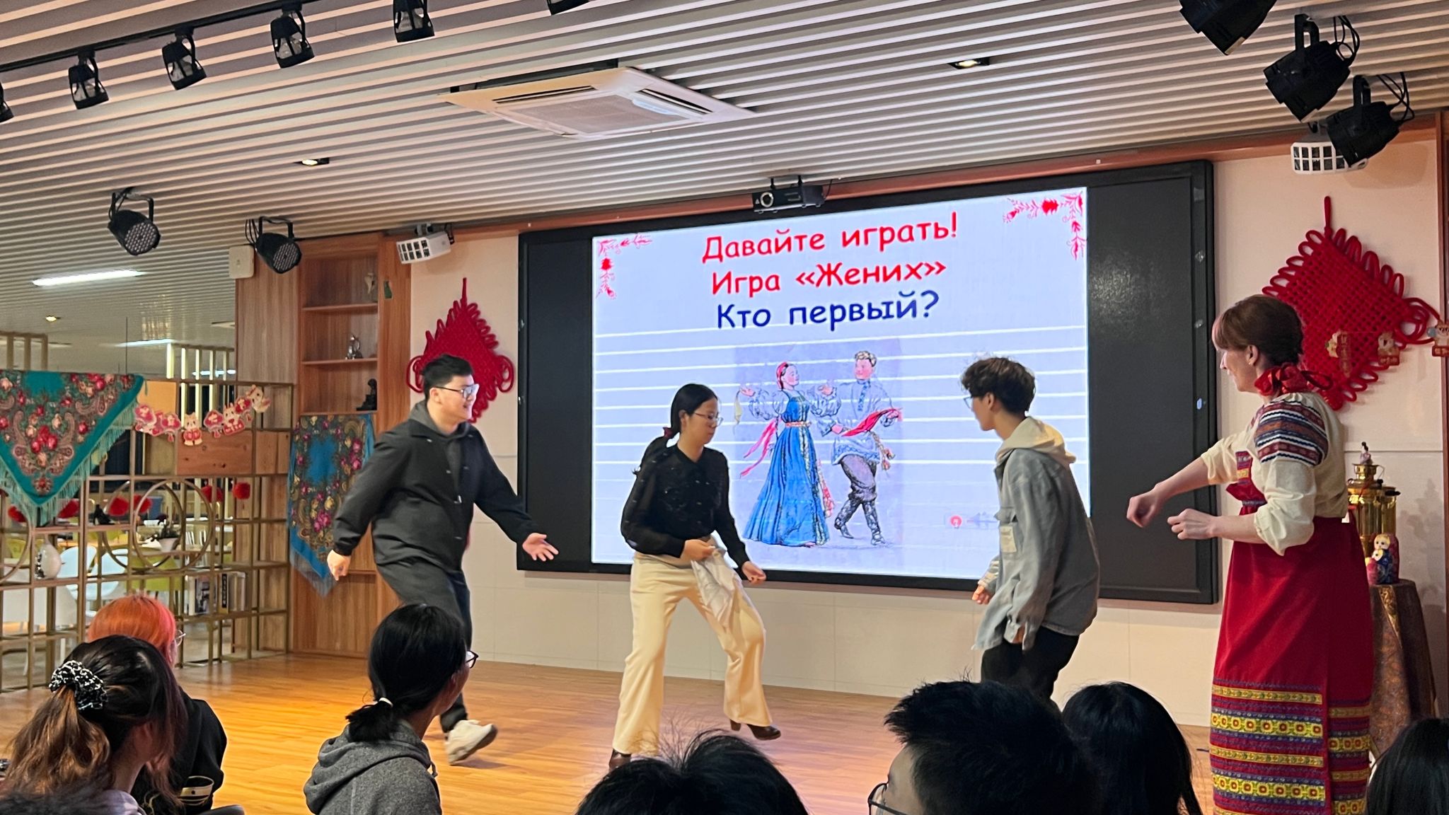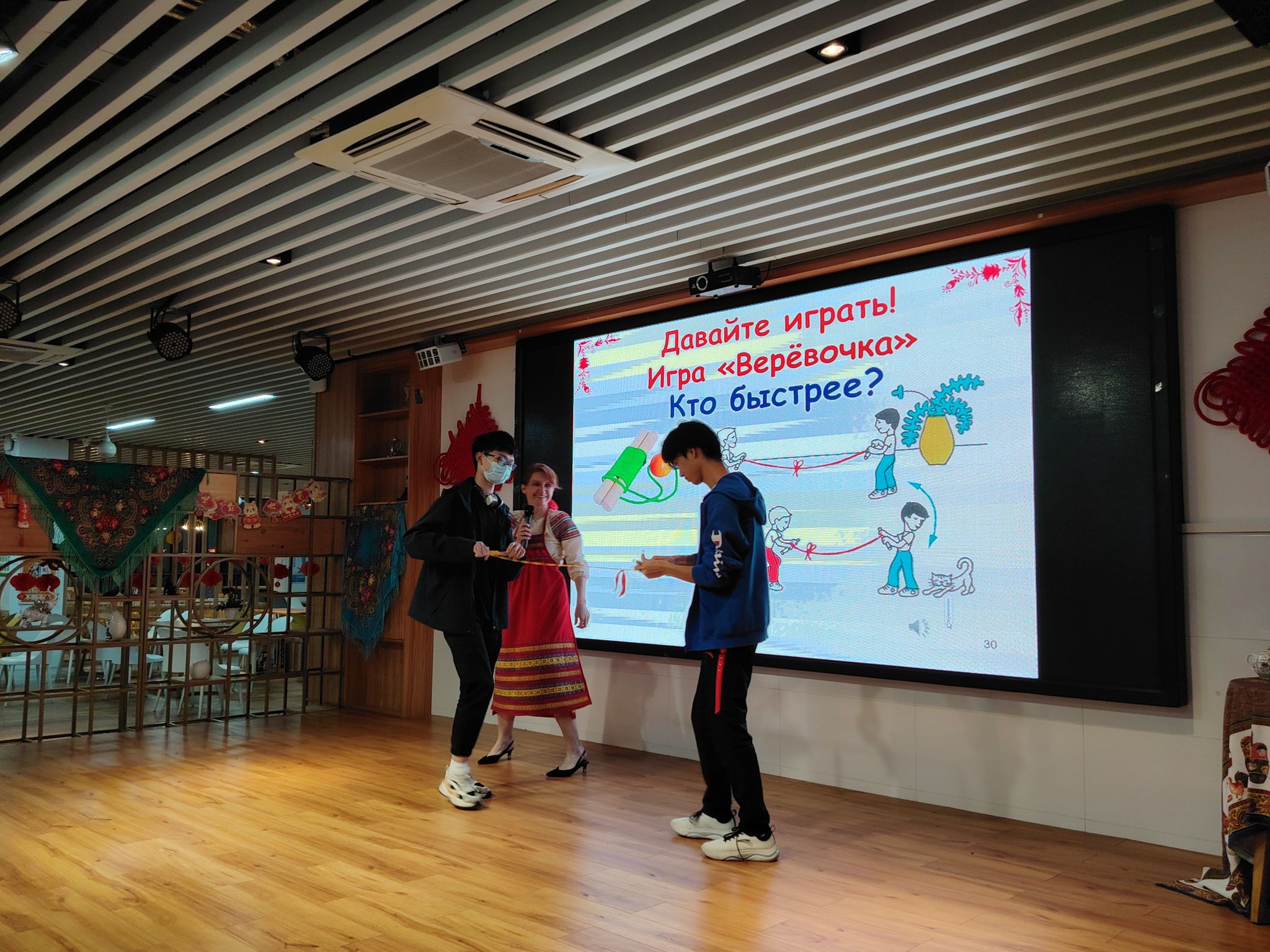 活動現場舉行了許多比賽和游戲:說出關于“謝肉節”的俄語諺語和俗語、卷“繩子”游戲(誰更快地把繩子卷到木棒上)、搶“帽子”游戲(誰更快地摘下對手頭上的帽子)、“新郎”(誰能在跳舞時機智地從女孩手中搶到手帕),以及拼單詞游戲(兩個隊從所給的字母中快速拼出與謝肉節相關的單詞)等。