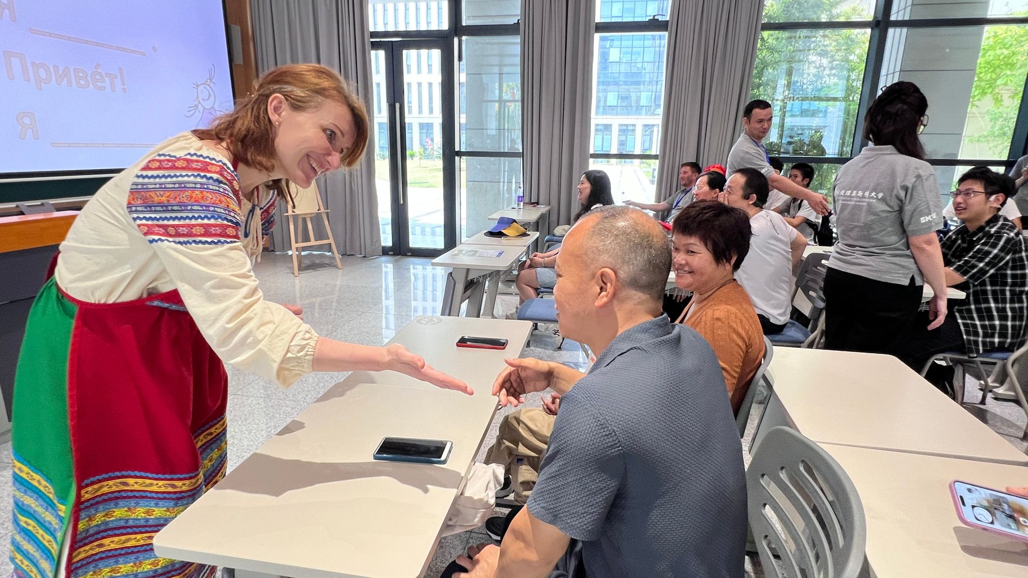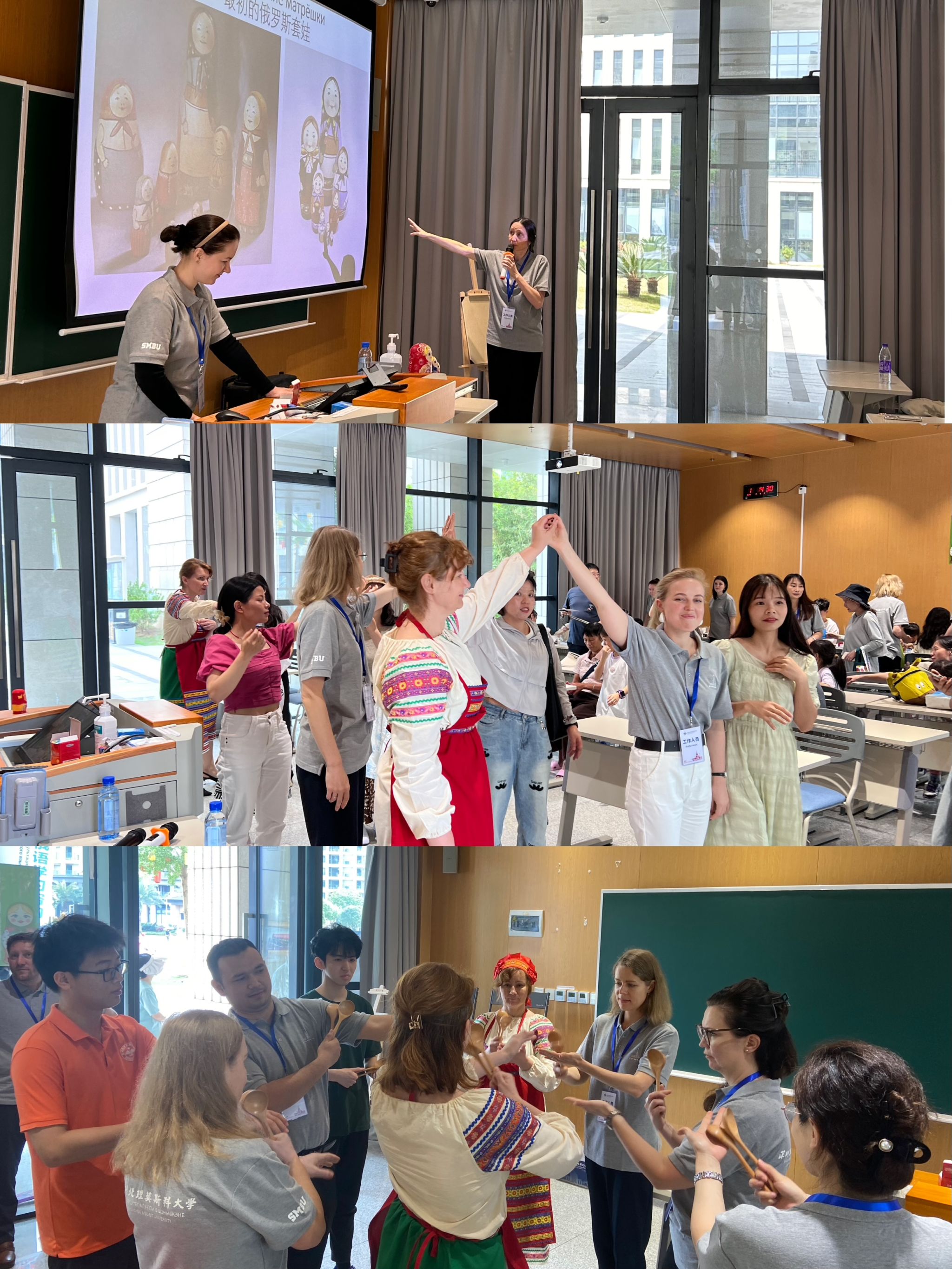 您可能會問:“怎么光講理論,沒有實踐呢?”當然,我們的活動中少不了課堂展示。這個環節由俄方教師塔拉索夫主講,俄語中心其他同事給予協助。此時,展臺變成了教室,聽眾變成了學生,他們積極回答有趣好玩的提問。來自深北莫不同專業的一、二、三年級的學生主動幫助這些新 “同學”學習俄語,并在“課堂”結束后愉快地解答考生家長感興趣的學校生活和學習方面的問題。課程結束后,這些考生家長高興地用俄語與教師們打招呼和告別!