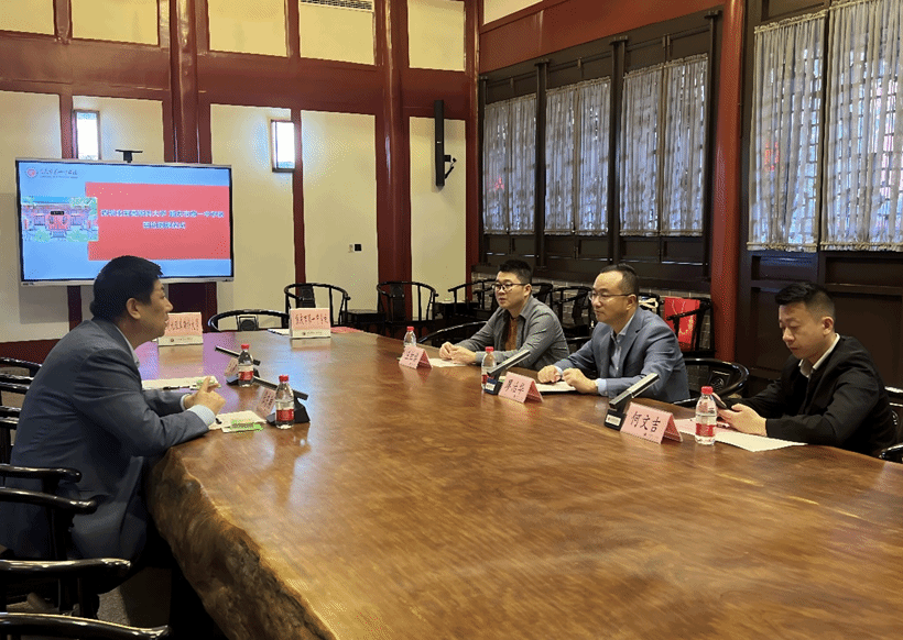 緊接著,招生組前往重慶一中,與重慶一中黨委副書記廖治華、副校長何文吉、教務(wù)處副主任王紅旗進(jìn)行了積極的交流互動。雙方就教育資源共享、學(xué)生培養(yǎng)路徑等話題交換了意見,重慶一中表達(dá)了希望教師能夠前往深北莫參觀學(xué)習(xí)的愿望,同時期待組織學(xué)生開展研學(xué)活動,張東翔教授也積極回應(yīng),表示愿意協(xié)助邀請專家到校舉辦講座,助力學(xué)生拓寬視野、提升能力。張東翔教授與廖治華副書記順利簽訂生源基地協(xié)議,并向重慶一中授予優(yōu)秀生源基地牌匾及銅盤,進(jìn)一步深化了兩校之間的合作關(guān)系。