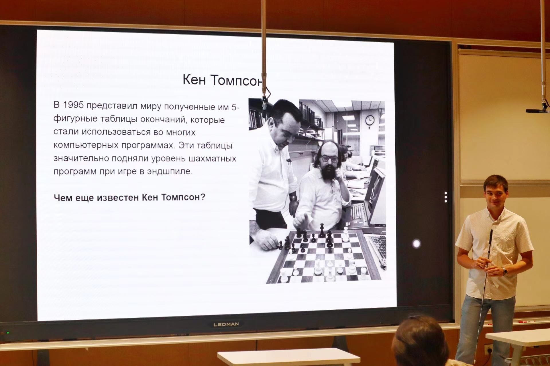 講座以羅蒙諾索夫七子殘局表為開端。莫斯佳耶夫·阿爾喬姆介紹了這項通過復雜計算得出的棋局成果,展示了數(shù)學模型如何在國際象棋的殘局分析中發(fā)揮關(guān)鍵作用,啟發(fā)學生認識數(shù)學在博弈中的實際應(yīng)用。